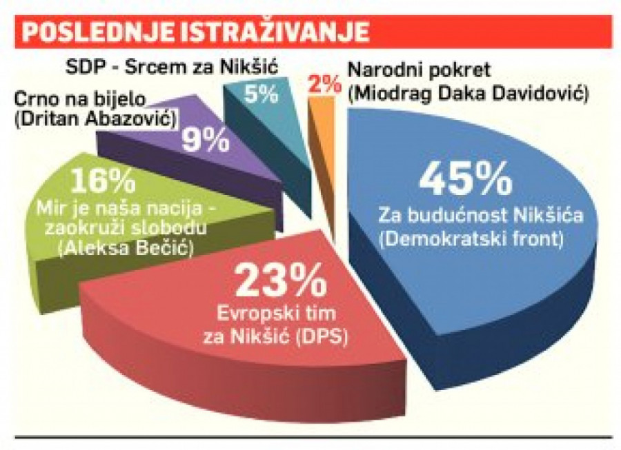 Prema tim rezultatima, prosrpski Demokratski front (DF), koji predvode Andrija Mandić i Milan Knežević, dobiće ubedljivo najviše glasova (trenutno je rejting na 45 odsto). Brojke mogu samo da budu još ubedljivije s obzirom na to da su im u utorak, dolaskom u Nikšić, podršku pružili lideri Srba s Kosova.