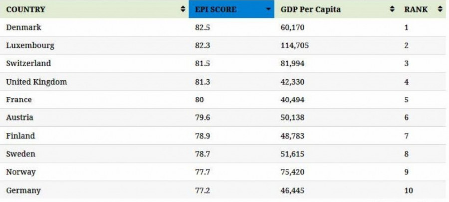 Slovenija, koja ima BDP od 25.946 USD, na 18. je mestu u svetu po EPI-ju.