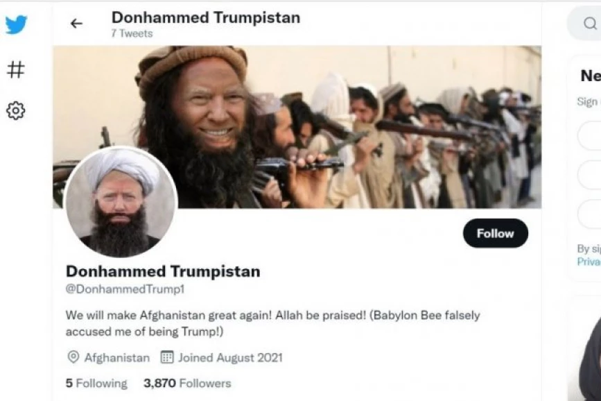 Pri tom, njegovo ime je Donhamed Trampisatan, a poznata izjava iz Trampove predsedničke kampanje "Učinimo Ameriku ponovo velikom" varirana je i glasi - "Učini Avganistan ponovo velikim".