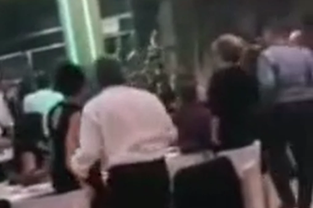 Jedan čovek udara drugog i kreće pometnja, tuča se nastavlja kroz celu salu, a gosti se sklanjaju.