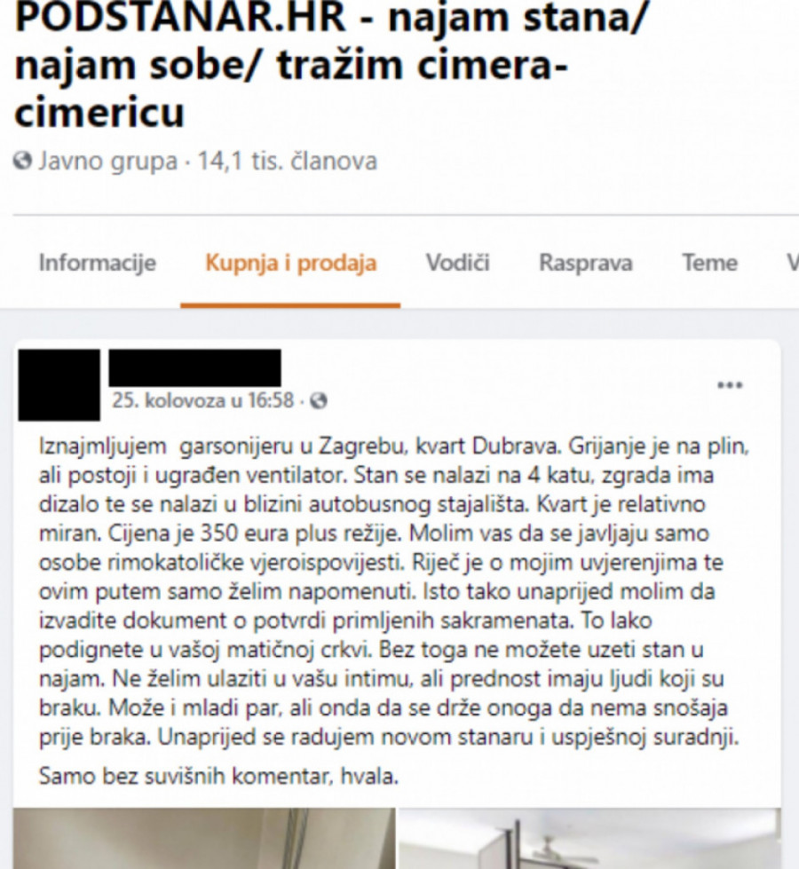 Reč je o mojim uverenjima te ovim putem samo želim da napomenem to. Isto tako unapred molim da izvadite dokument o potvrdi primljenih sakramenata. To lako podignete u vašoj matičnoj crkvi. Bez toga ne možete uzeti stan u najam. Ne želim ulaziti u vašu intimu, ali prednost imaju ljudi koji su braku. Može i mladi par, ali onda da se drže onoga da nema snošaja pre braka. Unapred se radujem novom stanaru i uspešnoj saradnji.Samo bez suvišnih komentara, hvala - napisala je ta gospođa u spomenutoj grupi.