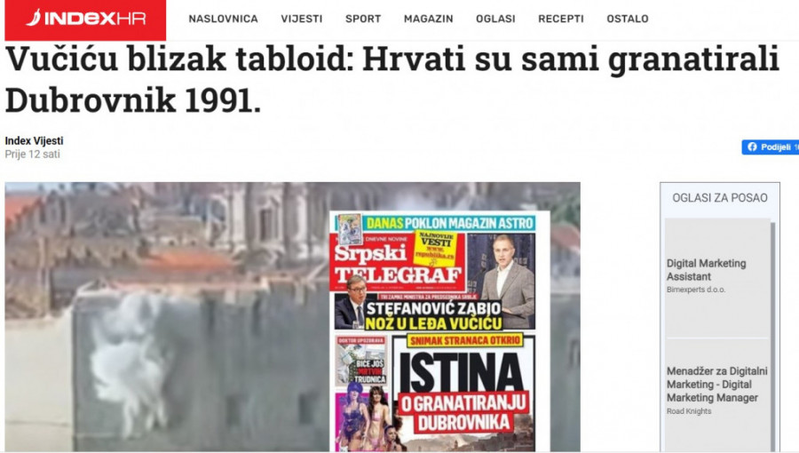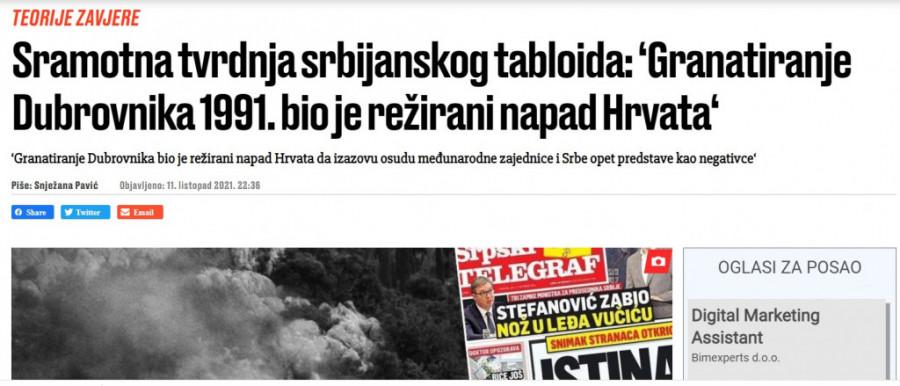 Srpski telegraf otkrio je da je granatiranje Dubrovnika 1991. bio režirani napad Hrvata da izazovu osudu međunarodne zajednice i Srbe opet predstave kao negativce. Besni zbog otkrivanja istine Hrvati su osuli paljbu po Srpskom telegrafu.