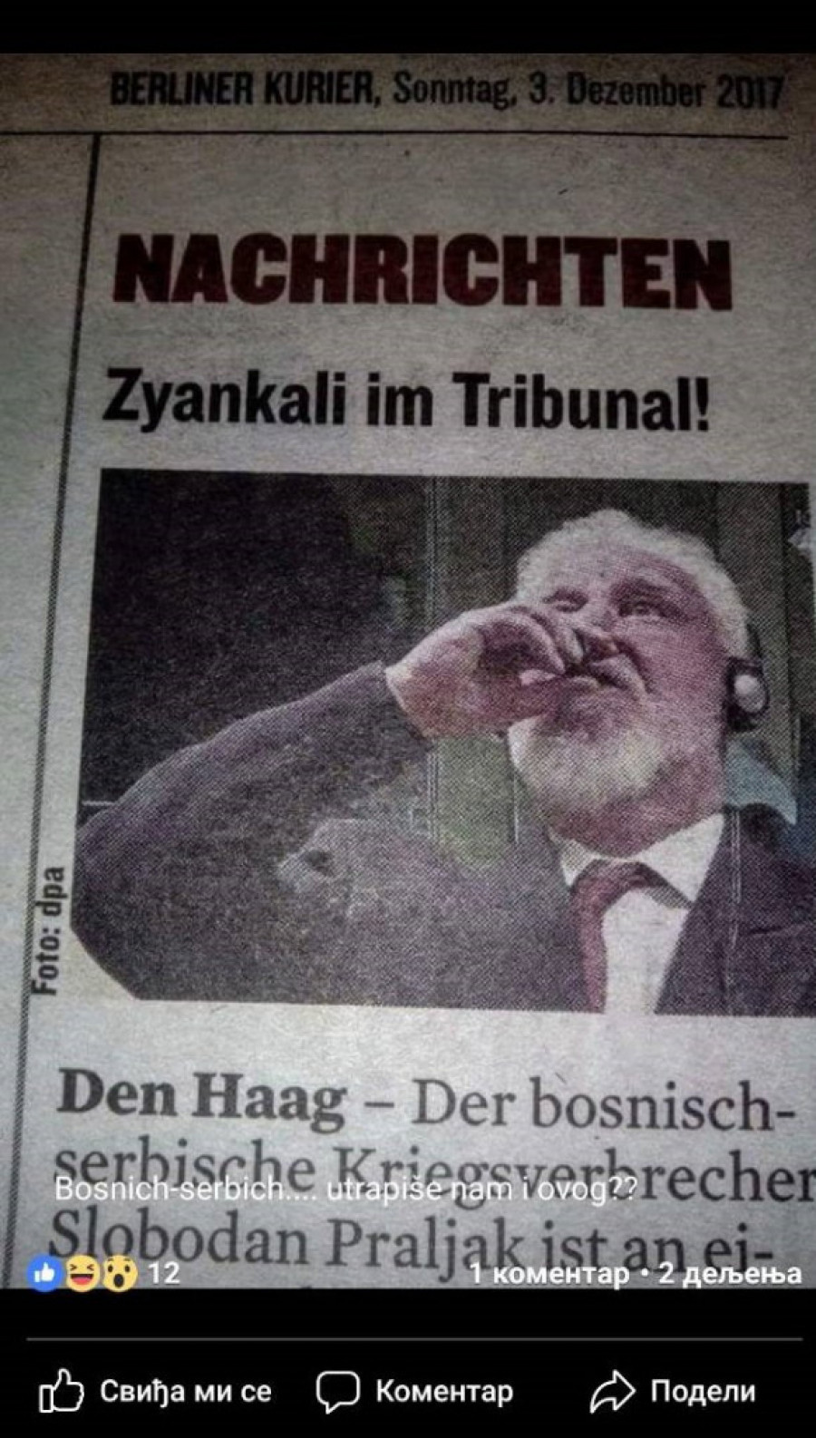 Berlinski Kurir perfidno je pokušao da osuđenog haškog zatvorenika Slobodana Praljka, koji pred kamerama ubio u sudnici Haškog tribunala, proglasi Srbinom.