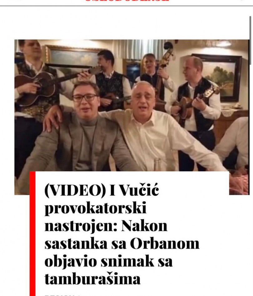 Sarajevski dnevni list "Oslobođenje" objavio je skandalozan tekst sa naslovom kojim tvrde da je predsednik Srbije Aleksandar Vučić provokatorski nastrojen time što je danas na svom Instagram profilu, nakon sastanka sa mađarskim premijerom Viktorom Orbanom objavio snimak na kome se vidi kako uz tamburaše peva pesmu "Tamo daleko".