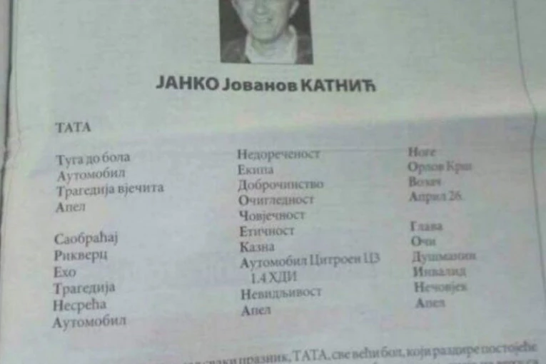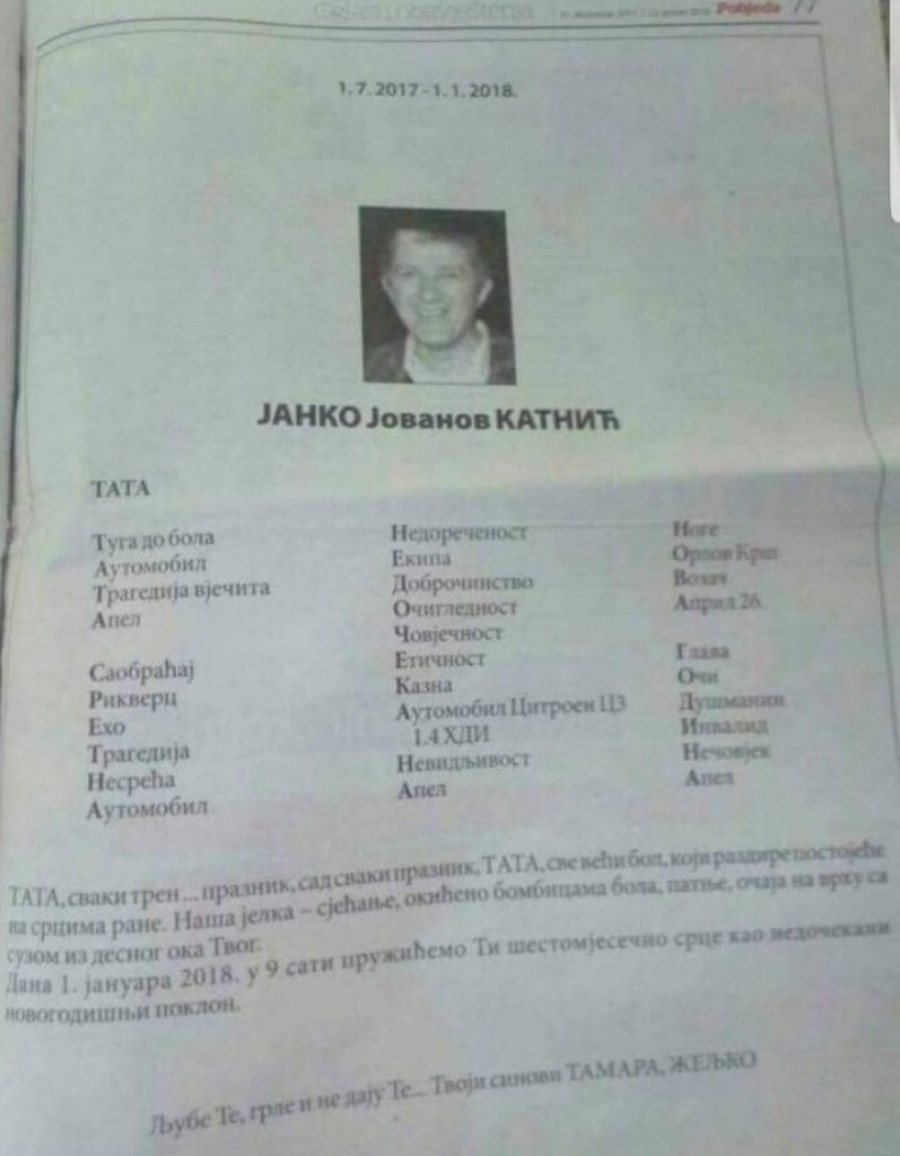 Profesoru ruskog jezika Janku Jovanovu Katniću koji je umro u julu prošle godine od posledica saobraćajne nesreće, članovi porodice su izdali bizarnu umrlicu u crnogorskom listu "Pobjeda".