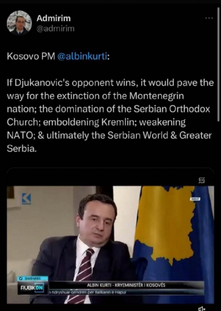 - Ako Đukanovićev protivnik pobedi, to bi otvorilo put nestanku crnogorske nacije, dominaciji Srpske pravoslavne crkve, ohrabrivanju Кremlja, slabljenju NATO-a i konačno do stvaranja “srpskog sveta” i velike Srbije - rekao je Milov fan Kurti, prenosi Objektiv.