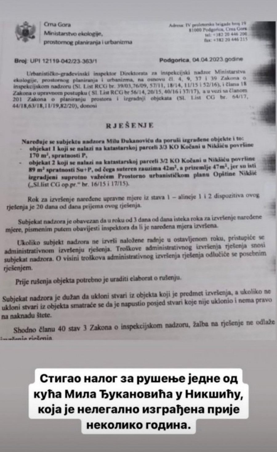 Iz tog pokreta su naveli da je građevinski inspektor dao rok od 20 dana odlazećem predsedniku Crne Gore da ukloni objekte u nikšićkom naselju Kočani, jer su u suprotnosti sa važećim Prostorno-urbanističkim planom opštine Nikšić, preneo je RTCG.