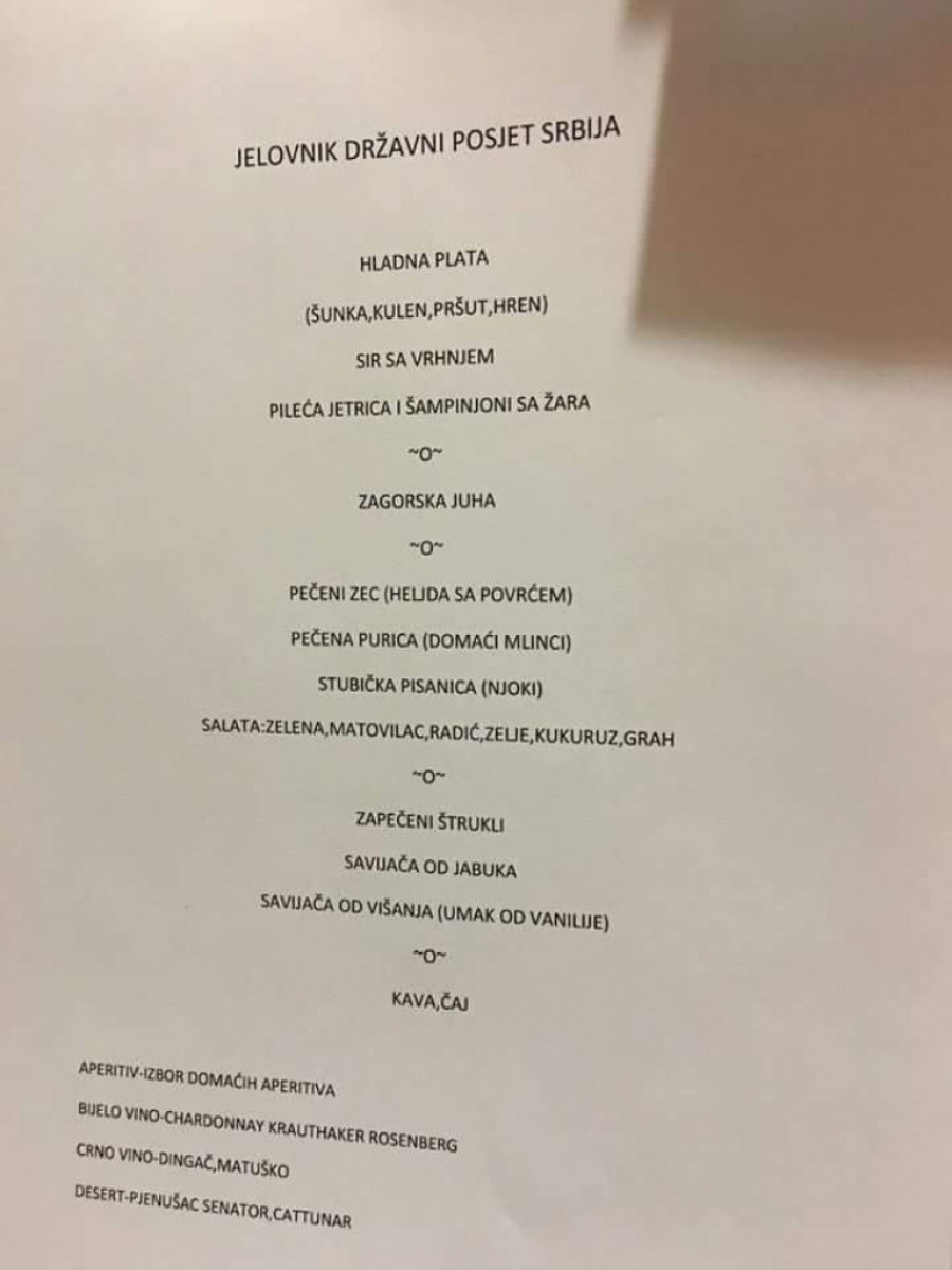 Foto: Promo fotoMeni, koji će se služiti na svečanoj večeri koju Kolinda Grabar-Kitarović priređuje za predsednika Vučića, sastoji se od tradicionalnih hrvatskih specijaliteta.