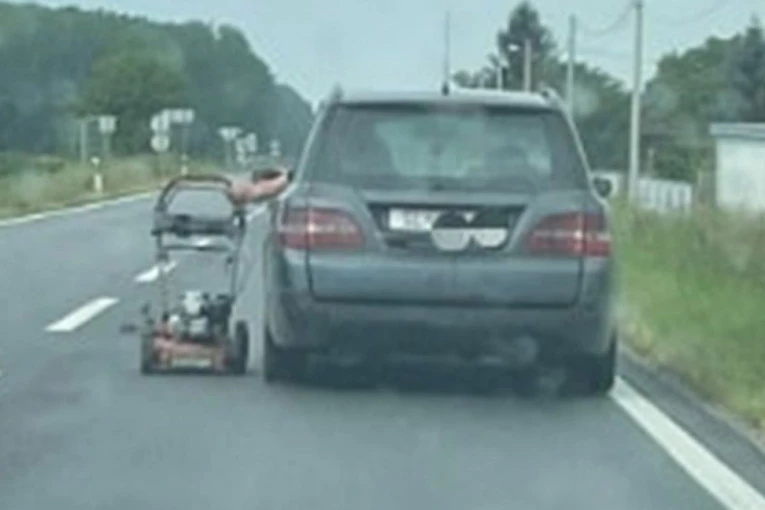 Na neverovatnoj fotografiji objavljenoj na Fejsbuk stranici Saobraćajne zgode i nezgode vidi se kako čovek istovremeno vozi auto i – kosilicu.