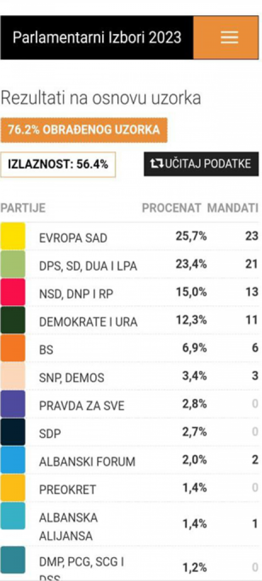 Pokret Evropa sad, po trenutnoj projekciji ima 23 poslanika, pokazuju preliminarni podaci Centra za monitoring i istraživanje (CeMI), na osnovu 72.5 odsto obrađenog uzorka izbora u Crnoj Gori.
