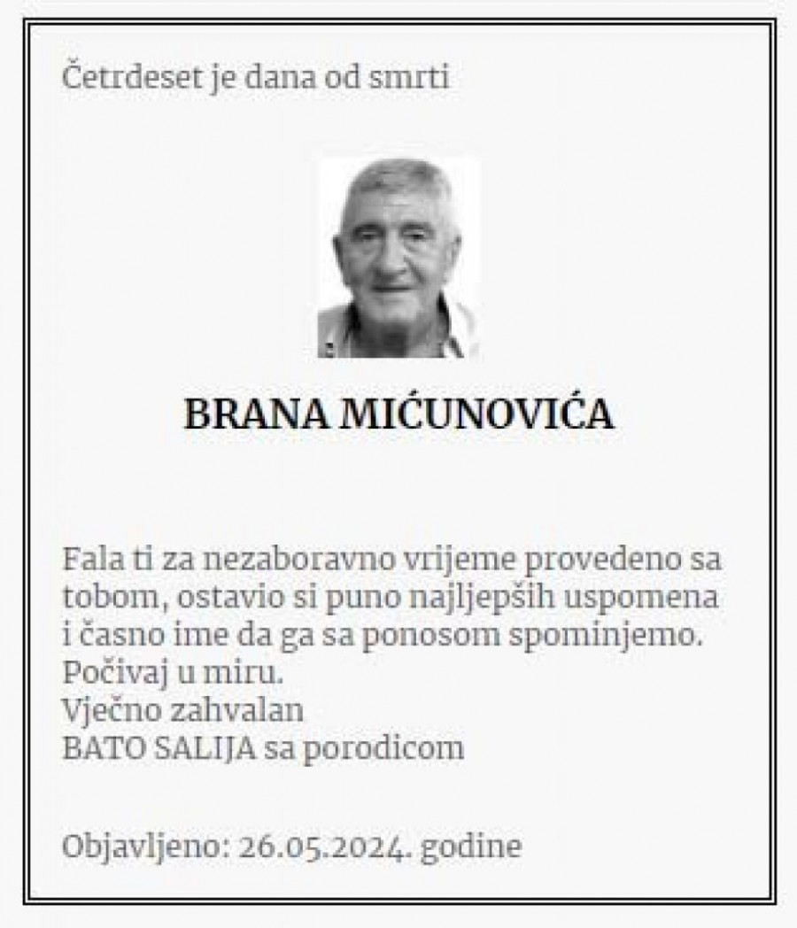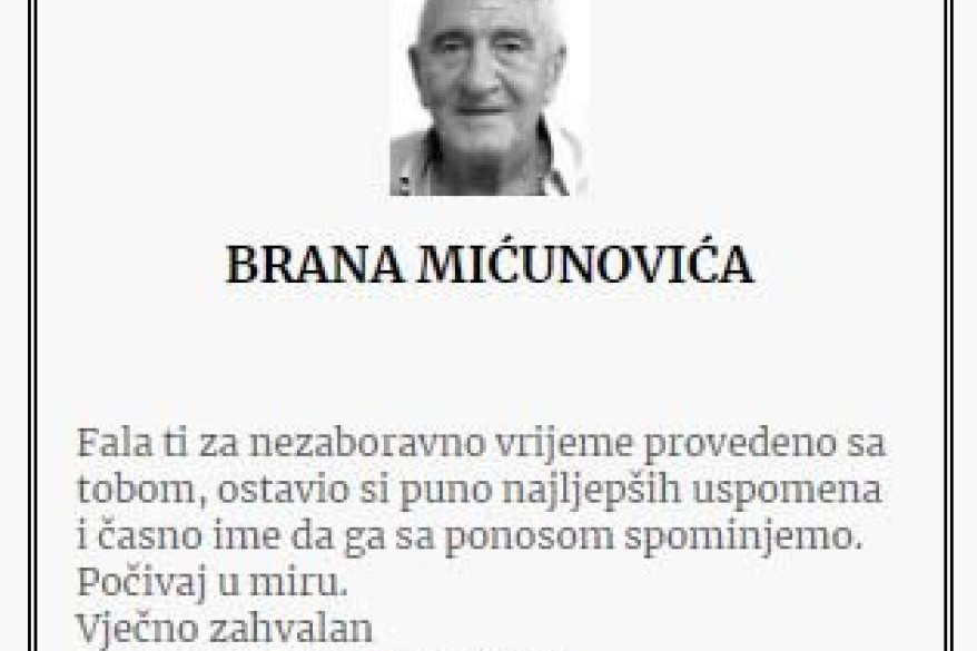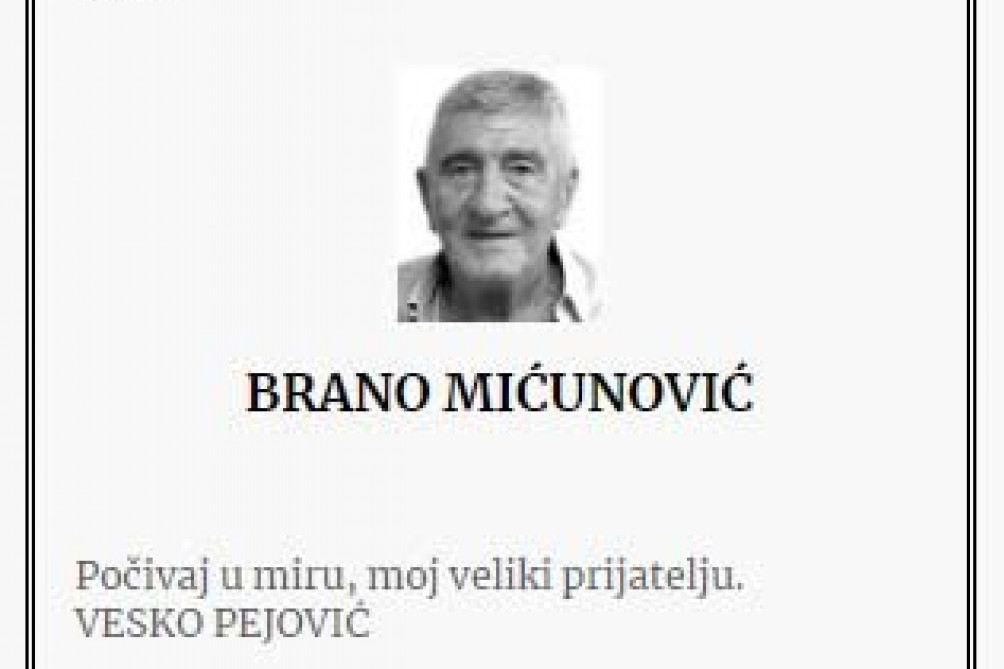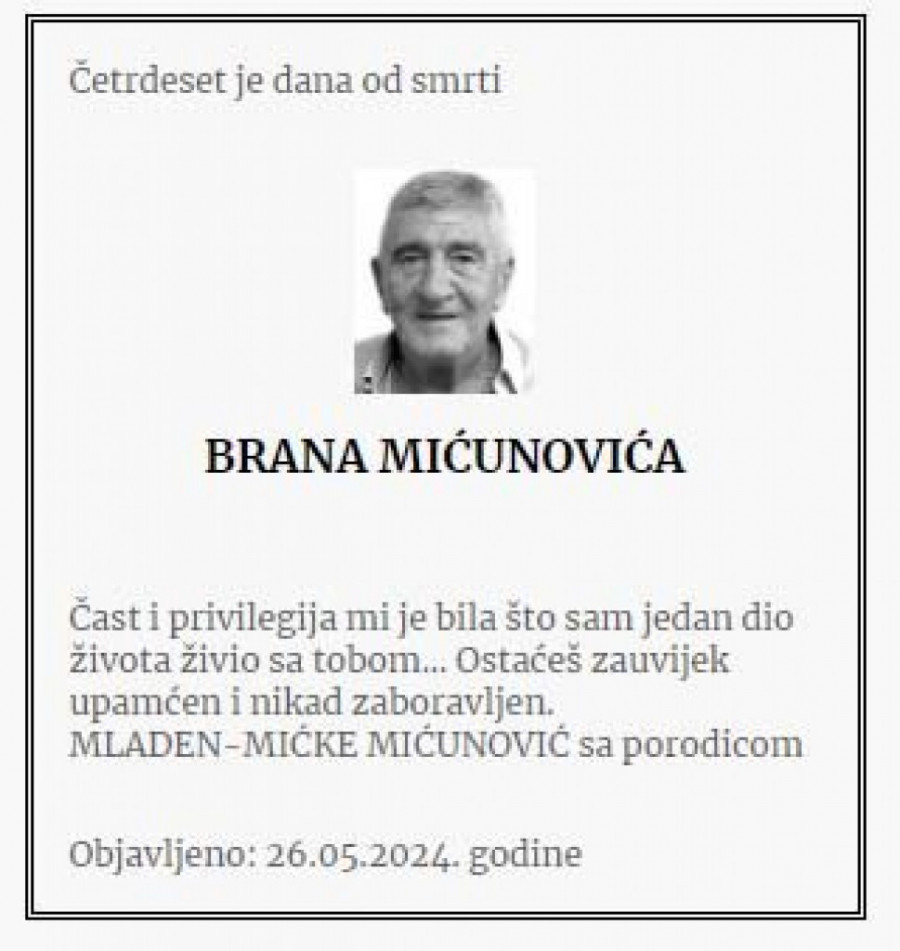 Branislav Brano Mićunović, crnogorski biznismen, preminuo je 18. aprila u Budvi od posledica teške bolesti. Nakon 40 dana, njegova porodica održala je pomen na groblju u njegovom rodnom mestu Moštanici kod Nikšića.