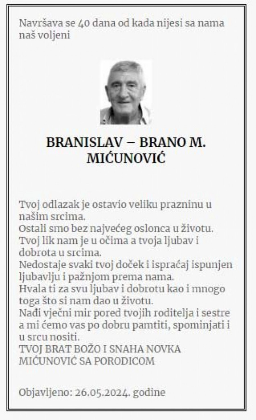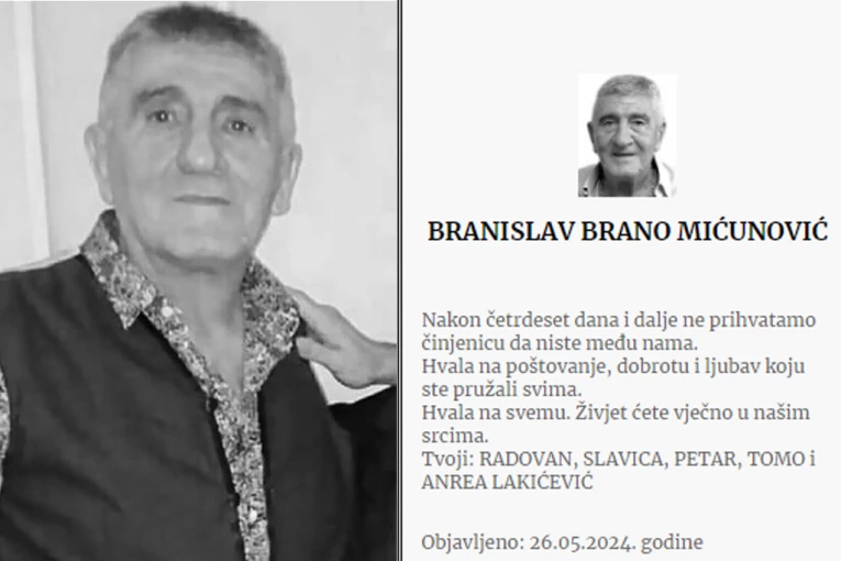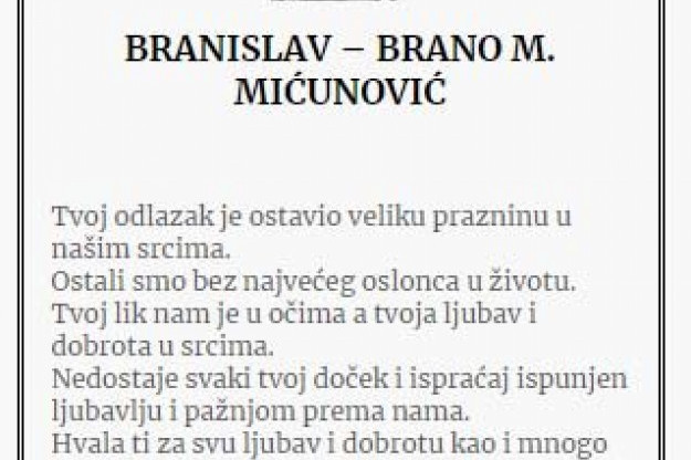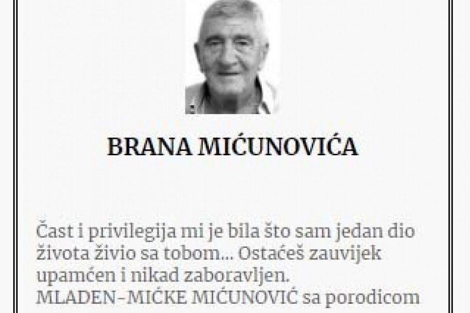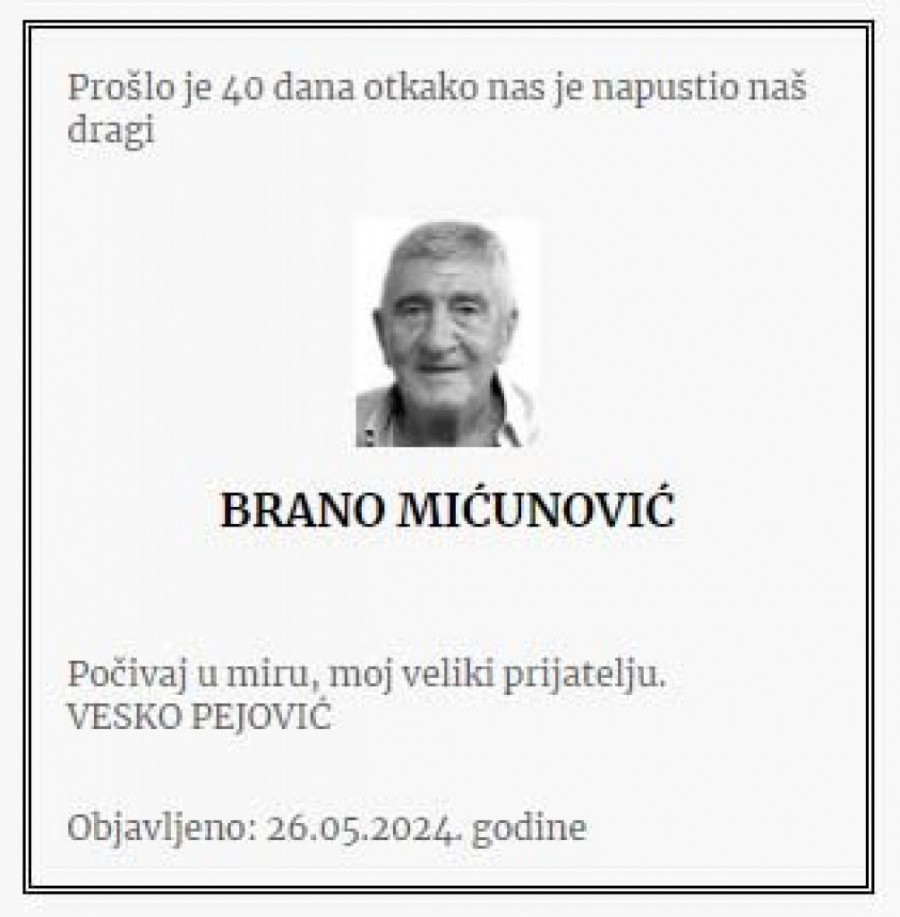 Branislav Brano Mićunović, crnogorski biznismen, preminuo je 18. aprila u Budvi od posledica teške bolesti. Nakon 40 dana, njegova porodica održala je pomen na groblju u njegovom rodnom mestu Moštanici kod Nikšića.