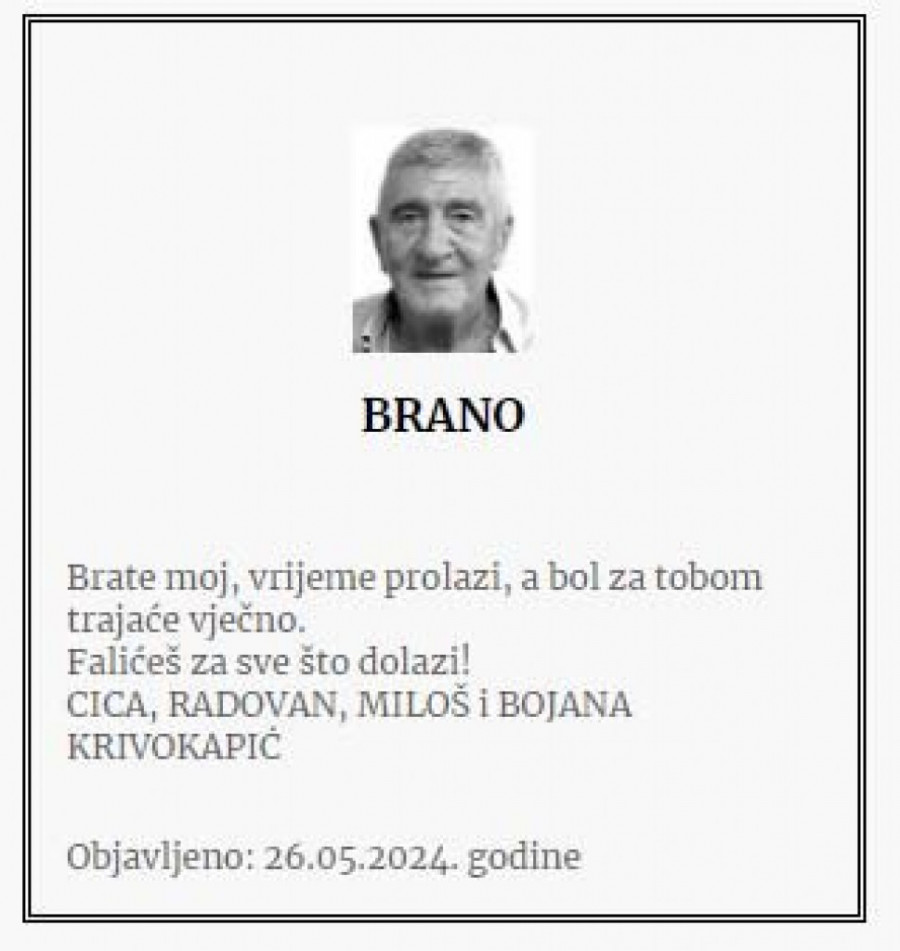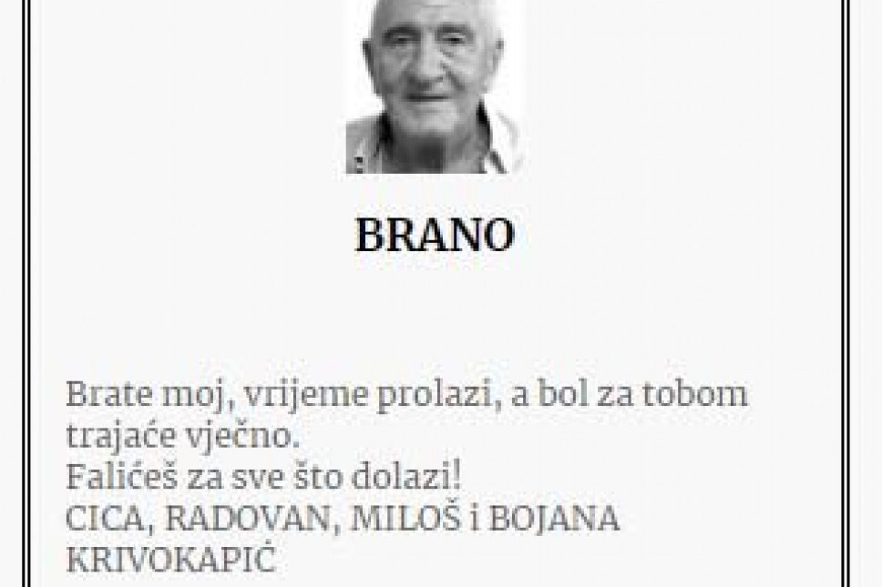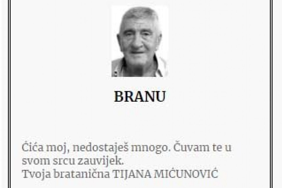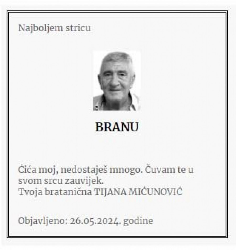 Porodica je u čitulji izrazila sećanje na zajedničke dane i ljubav koju su delili sa Branom, ističući njegove moralne vrednosti i plemenitost koje će zauvek nositi u srcima. Navedeno je da će najuža rodbina posetiti njegovu večnu kuću, zaliti je suzama i pokloniti se njegovim senima.