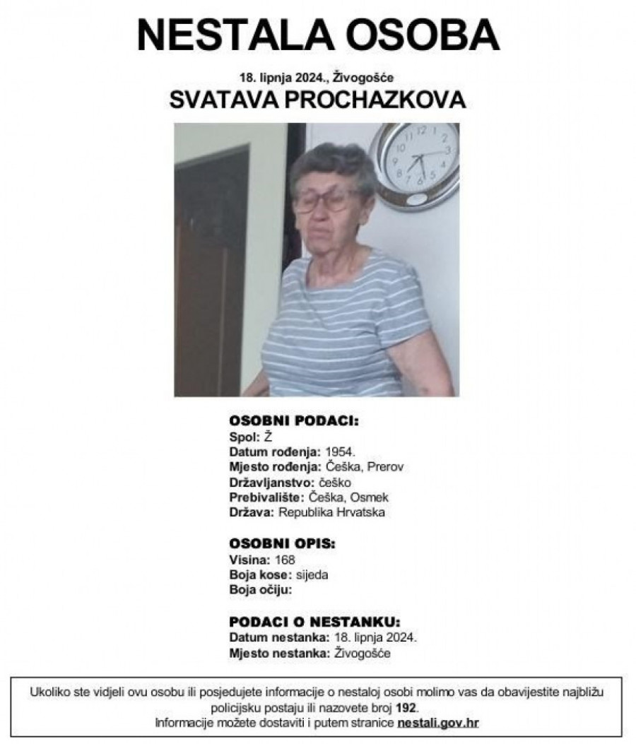 Prochazkova ima sedu kosu i slabije je telesne građe. Policija je izdala apel svim građanima koji su je možda videli ili imaju bilo kakve informacije o njenom nestanku da se jave u najbližu policijsku stanicu ili da pozovu broj 192.