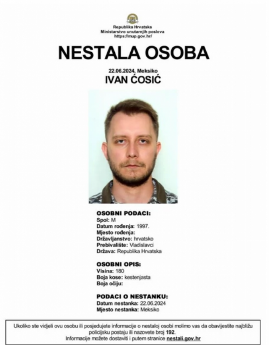 Državljanin Hrvatske, Ivan Ćosić (27), za kojim se traga od 22. juna, preminuo u Meksiku, potvrdilo je Ministarstvo spoljnih poslova Hrvatske.