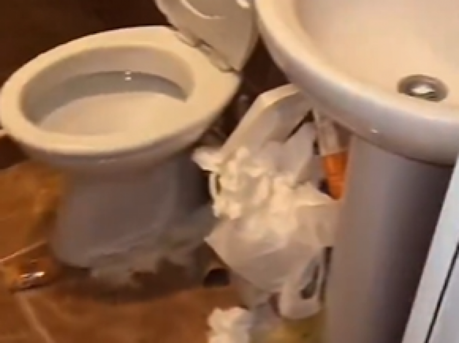 Snimak kupatila otkriva zastrašujuće stanje higijene. Kupatilo je prepuno prljavštine i nereda, razbacanih ubrusa po pločicama.