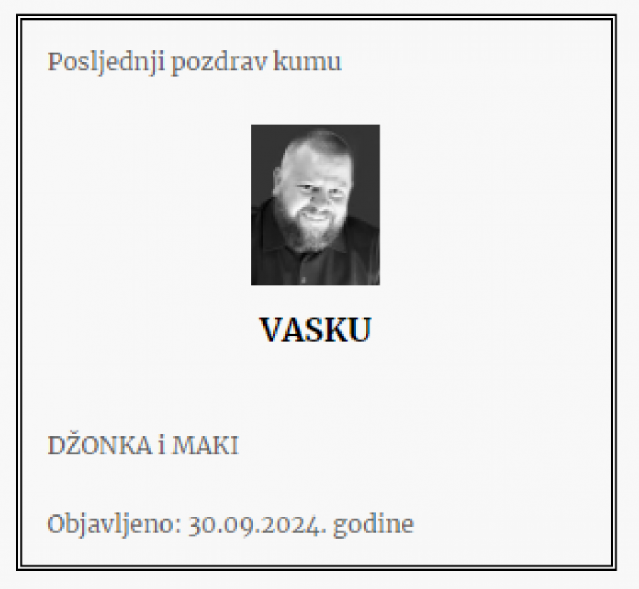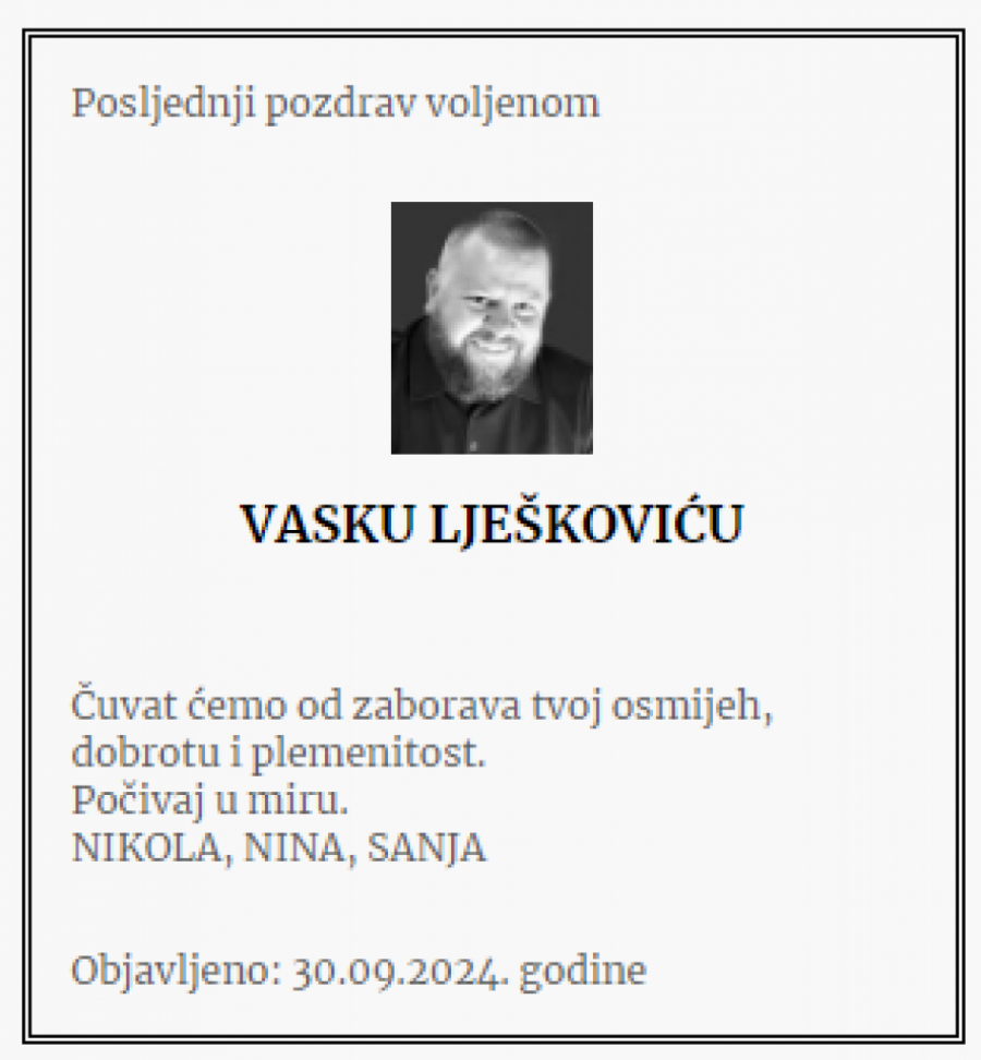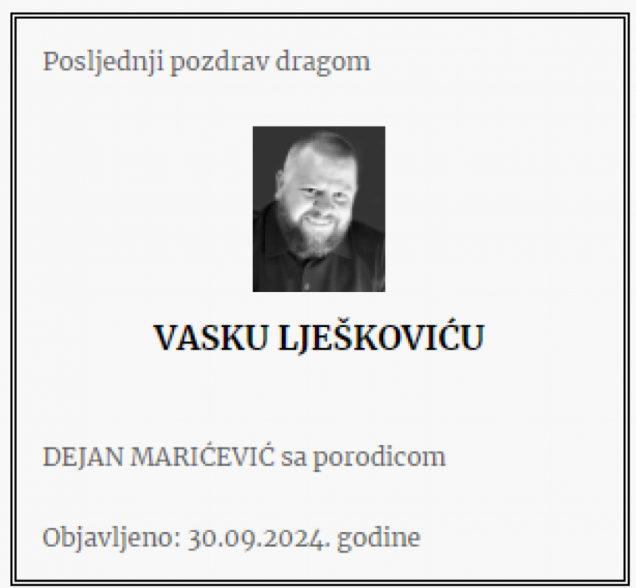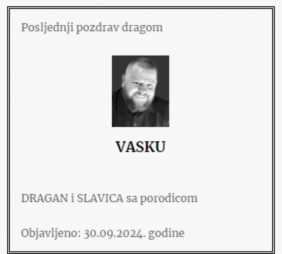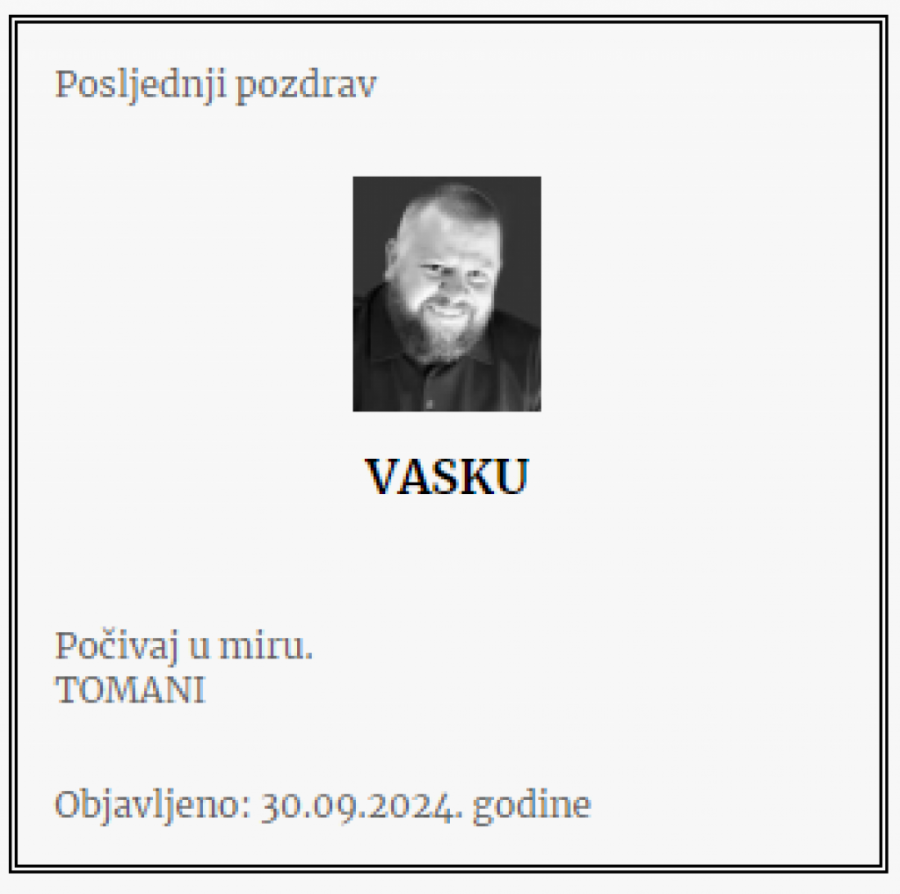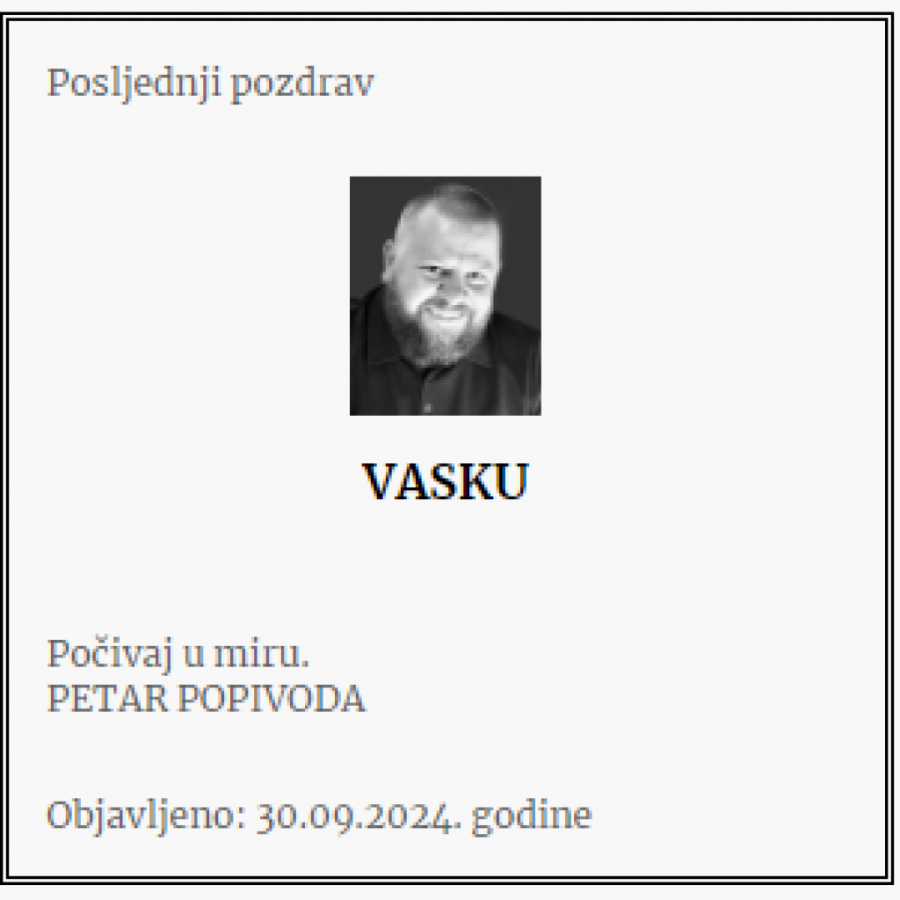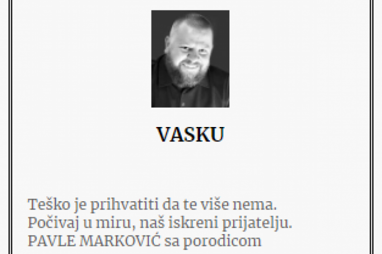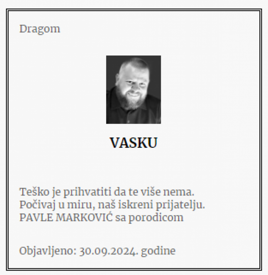 - Brate moj! Nedostajaćeš za sve što dolazi i što bez tvog prisustva neće biti potpuno. Ostavio si za sobom žal koji neće utihnuti, ali će plamen tvoje energije i ljudskosti prkosno bukteti i osvetljavati nam put! Počivaj u miru - piše u čitulji.