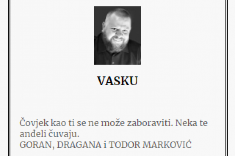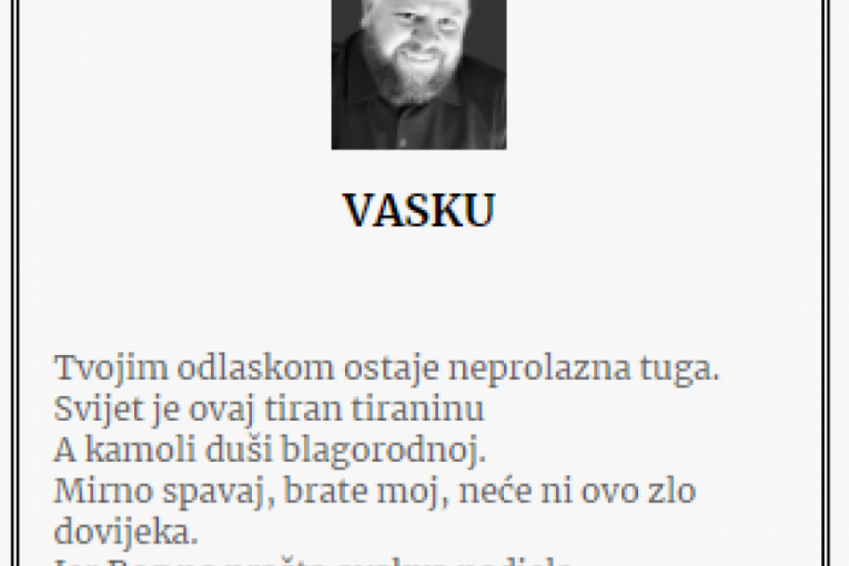 - Brate moj, tu si dok postojimo, tu kao uvek što si bio, tu gde treba. Bole ove rane, bole suze i duša tvoja bratska. Prkosićemo im osmehom i onom našom voljom koja im je nedostižna i nepregledna. Volimo te i čuvamo u našim srcima zauvek. Kume naš, vilo naša... Što nas rani? Što nam napravi? - piše između ostalog u jednoj od čitulja.