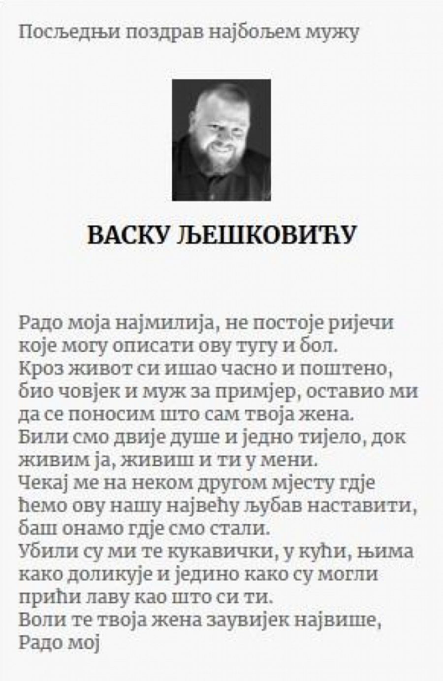 - Rado moja najmilija, ne postoje reči koje mogu opisati ovu tugu i bol. Kroz život si išao časno i pošteno, bio čovek i muž za primer, ostavio mi da se ponosim što sam tvoja žena. Bili smo dve duše i jedno telo, dok živim ja, živiš i ti u meni. Čekaj me na nekom drugom mestu gde ćemo ovu našu najveću ljubav nastaviti, baš onamo gde smo stali. Ubili su mi te kukavički, u kući, njima kako dolikuje i jedino kako su mogli prići lavu kao što si ti. Voli te tvoja žena zauvek najviše, Rado moj - poručila je Lješkovićeva supruga.