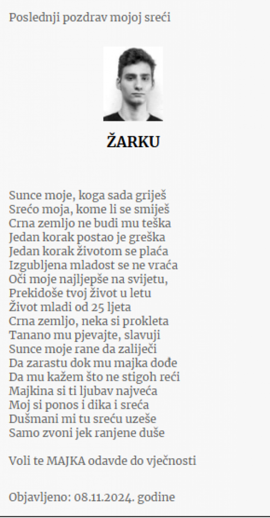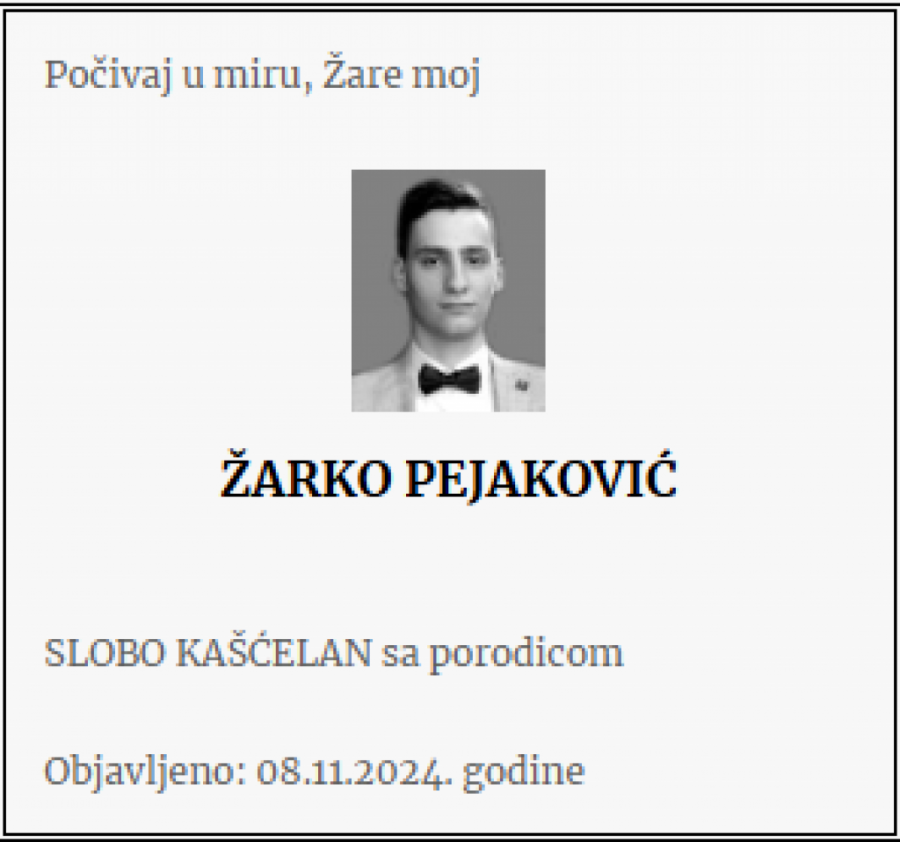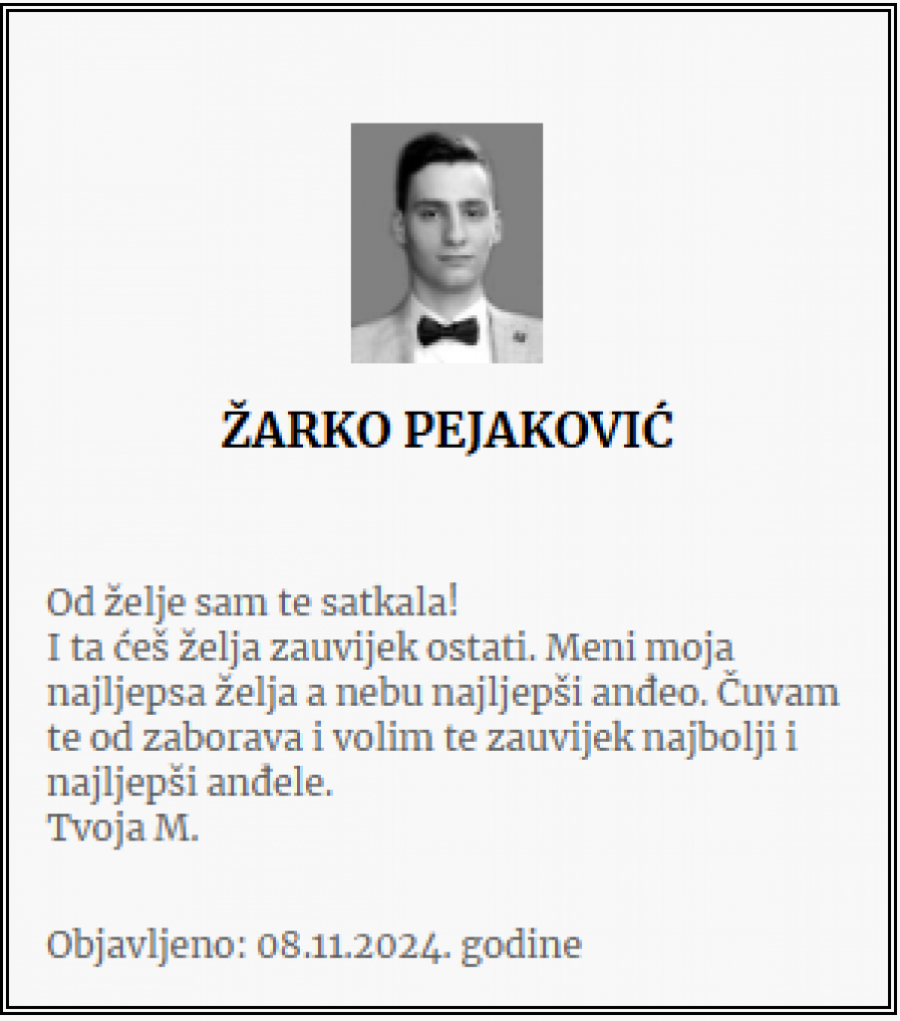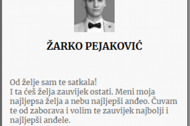- Poslednji pozdrav, mojoj sreći Žarku, sunce moje, koga sada greš. Srećo moja, kome li se smeš, crna zemljo ne budi mu teška jedan korak postao je greška. Jedan korak životom se plaća, izgubljena mladost se ne vraća. Oči moje najlepše na svetu, prekidoše tvoj život u letu. Život mladi od 25 leta. Crna zemljo, neka si prokleta, tanano mu pevajte, slavuji. Sunce moje rane da zaleči, da zarastu dok mu majka dođe. Da mu kažem što ne stigoh reći, majkina si ti ljubav najveća. Moj si ponos i dika i sreća. Dušmani mi tu sreću uzeše. Samo zvoni jek ranjene duše. Voli te majka odavde do večnosti - navodi se u čitulji koju potpisuje majka Žarka Pejakovića.