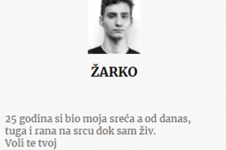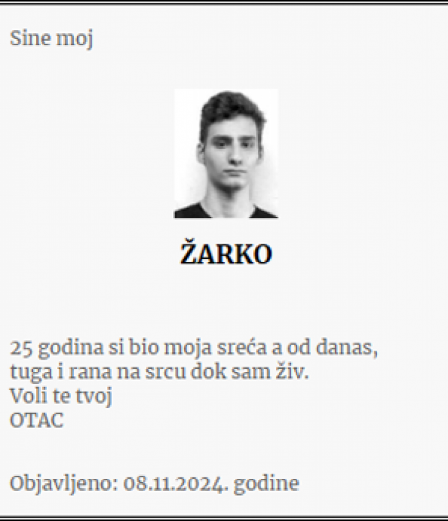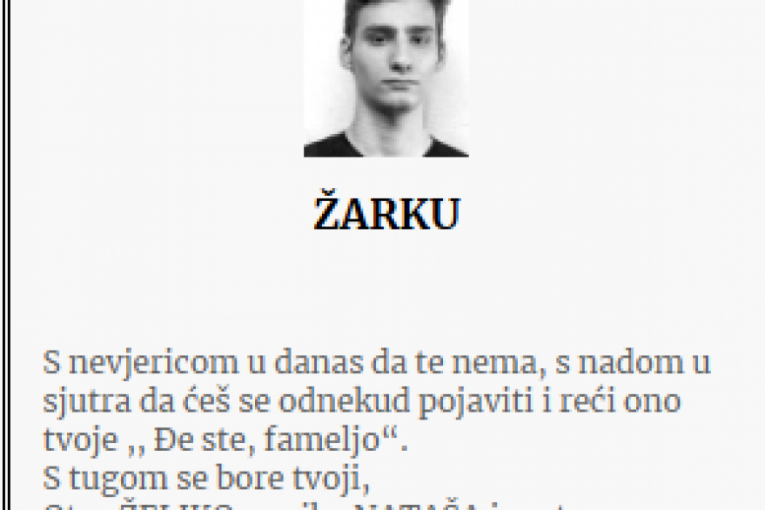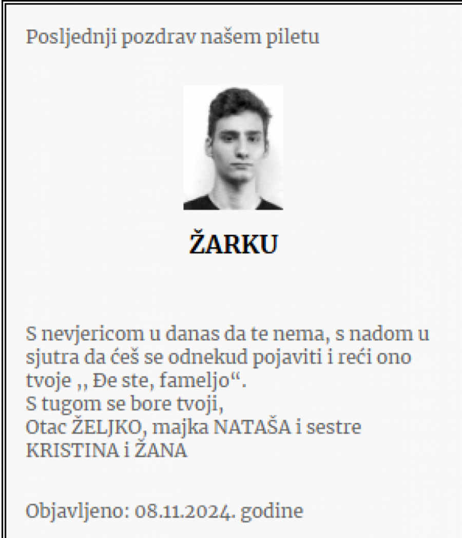 - Poslednji pozdrav našem piletu Žarku, s nevericom u danas da te nema, s nadom u sutra da ćeš se odnekud pojaviti i reći ono tvoje: "Đe ste, fameljo?" S tugom se bore tvoji - ovu čitulju objavila je njegova porodica, dok je njegovi roditelji objavili i posebne čitulje.