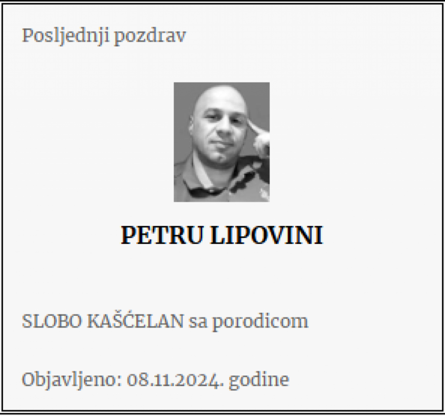 Takođe, istu poruku poslao je i Lipovini: "Poslednji pozdrav Petru Lipovini, od Sloba Kašćelana da porodicom." Kavčane nisu zaboravili ni njihovi saborci pa su im i oni objavili grupnu čitulju.