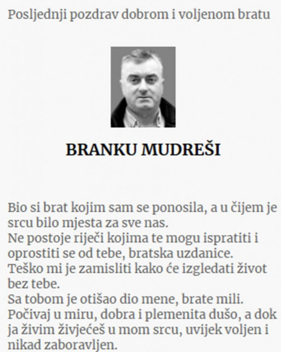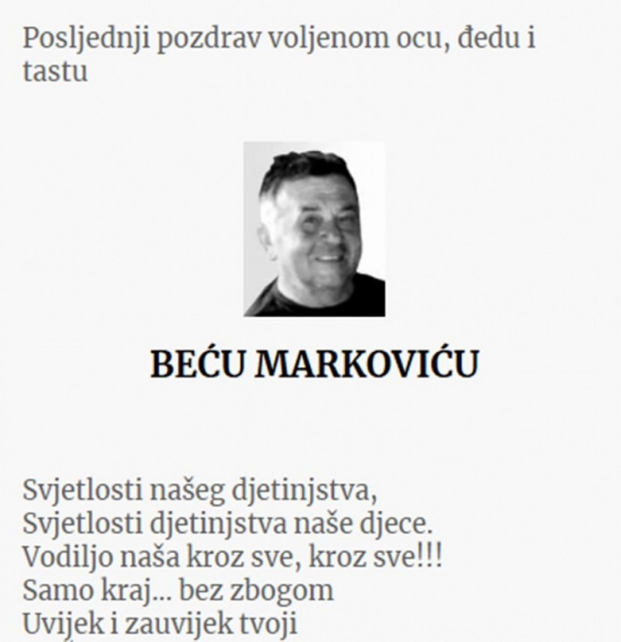 - Sve što je bilo časno, plemenito u jednoj ljudskoj duši, bilo je u tvojoj. Nema suza koje te mogu oplakati, reči koje t mogu ožaliti, niti vremena u kom te možemo zaboraviti. Hvala ti za sve - navodi se u jednoj od čitulja za Radomira Markovića.