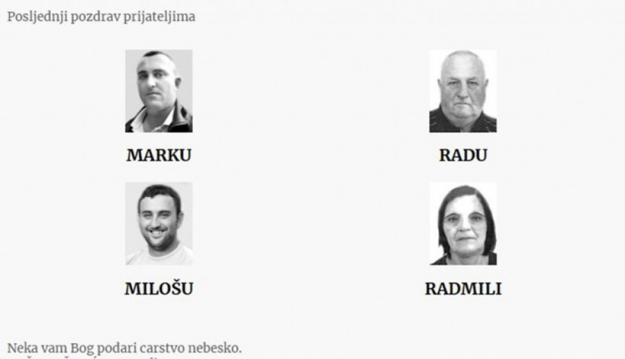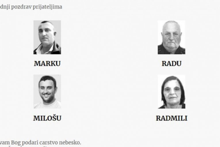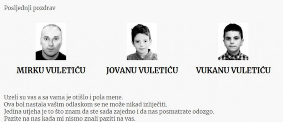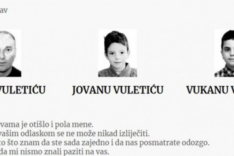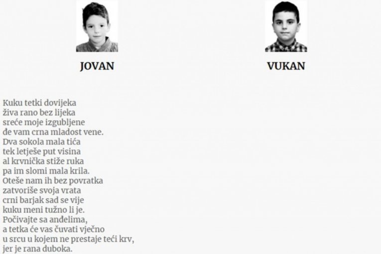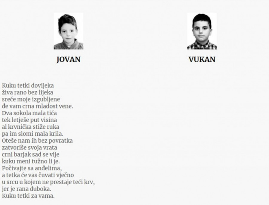 - Kuku tetki doveka, živa rano bez leka. Sreće moje izgubljene, gde vam crna mladost vene. Dva sokola mala, tića tek leteše put visina, ali krvnička stiže ruka, pa im slomi mala krila. Oteše nam ih bez povratka, zatvoriše svoja vrata, crni barjak sad se vije kuku meni tužno li je. Počivajte sa anđelima, a tetka će vas čuvati večno u srcu u kojem ne prestaje teći krv, jer je rana duboka. Kuku tetki za vama - piše u čitulji koju je potpisala tetka ubijene dece.