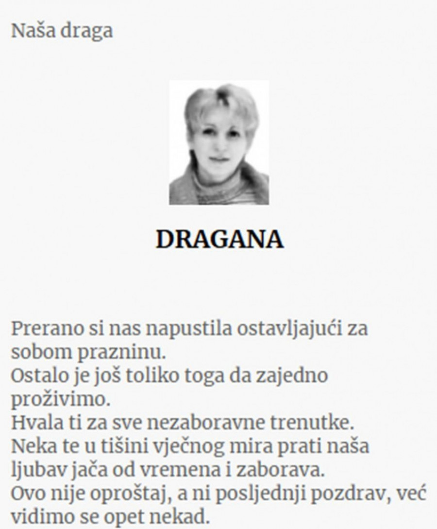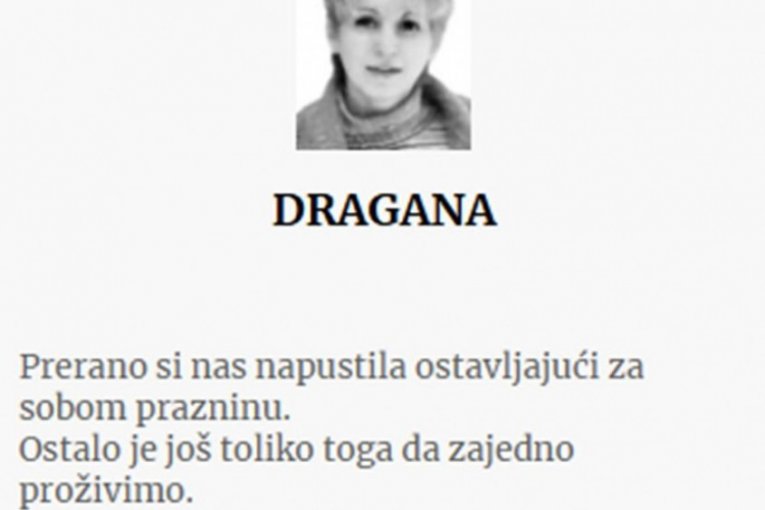 - Draga naša Dragana, tvojim odlaskom svet nam se srušio, teško je prihvatiti da više nisi tu, da tvoj osmeh, tvoja toplina i ljubav vie neće ispunjavati naše živote Bila si naša sestra i tetka, ali i oslonac i svetlost. Tvoje srce bilo je veliko, tvoja briga za porodicu neizmerna.
