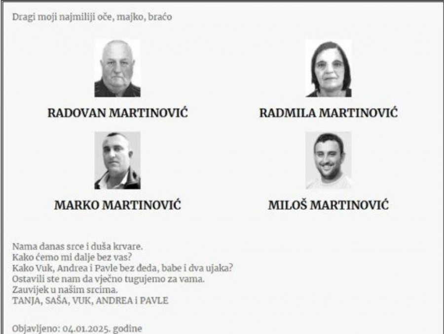 - Dragi moji najmiliji oče, majko, braćo... Nama danas srce i duša krvare. Kako ćemo mi dalje bez vas? Kako Vuk, Andrea i Pavle bez dede, babe i dva ujaka? Ostavili ste nam da večno tugujemo za vama. Zauvek u našim srcima - stoji u čitulji koju su potpisali Tanja, Saša, Vuk, Andrea i Pavle.
