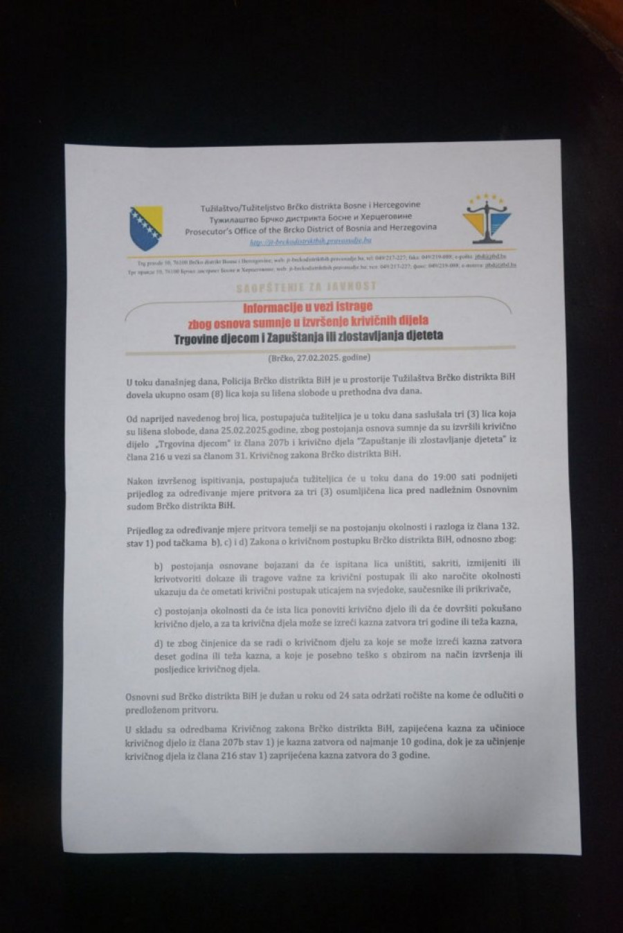 Postupajuća tužiteljka je u toku dana saslušala tri lica koja su lišena slobode dana 25.02.2025.godine, zbog postojanja osnova sumnje da su izvršili krivično delo "Trgovina decom" iz člana 207b i krivično delo "Zapuštanje ili zlostavljanje deteta" iz člana 216 u vezi sa članom 31. Krivičnog zakona Brčko distrikta BiH.