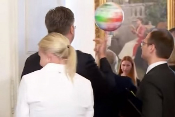 Naime, dok je izlazio s konferencije za medije sa norveškom koleginicom, Plenković je potpuno infantilno odlučio da se poigra sa loptom koju je dobio na poklon i to tako što je rešio da je u košarkaškom stilu zavrti na prstu.