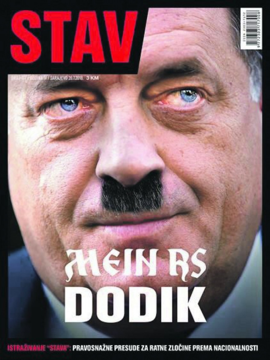 Milorad Dodik sa brkovima Adolfa Hitlera na naslovnoj strani sarajevskog nedeljnika Stav! Uz ovu skandaloznu foto-montažu lika predsednika Republike Srpske dodat je i naslov "Mein RS", koji asocira na čuveno kapitalno delo nacističkog vođe "Mein Kampf" (Moja borba).
