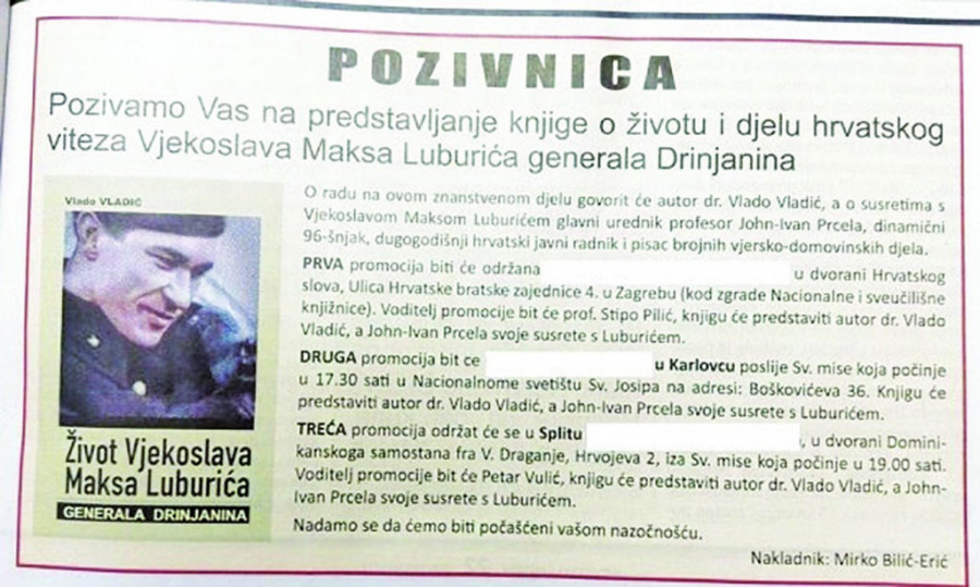 Katolička crkva u Karlovcu i Splitu ustupila je prostor za predstavljanje knjige o Vjekoslavu Maksu Luburiću, idejnom tvorcu i zapovedniku sistema koncentracionih logora među kojima je najveći Jasenovac.