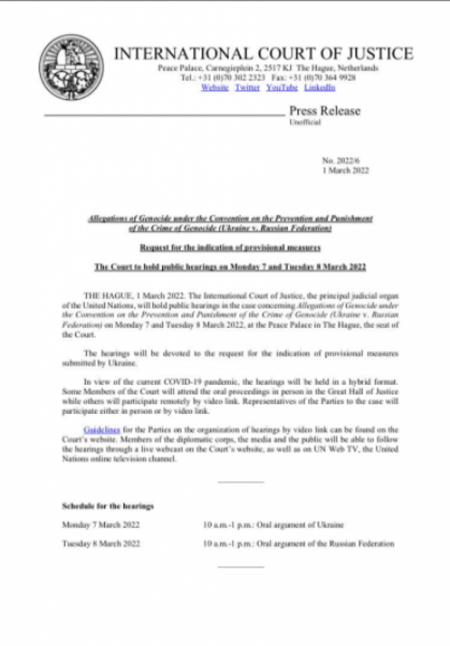 Međunarodni sud pravde POTVRDIO: Uskoro saslušanje u Hagu (FOTO) Autor: Republika Svet 01.03.2022 22:10 Pratite nas i putem Android ili iOS aplikacija Međunarodni sud pravde (ICJ) u Hagu, glavni pravosudni organ Ujedinjenih nacija, potvrdio je danas da će održati saslušanja 7. i 8. marta o ratu u Ukrajini. Foto: Tanjug/AP Međunarodni sud pravde održaće saslušanja povodom ruskog rata u Ukrajini. Javne rasprave o optužbama za genocid protiv Rusije biće održane od 7. do 8. marta i biće prenošene uživo. Ovo je usledilo nakon što je Ukrajina u nedelju podnela tužbu Međunarodnom sudu pravde zbog "spora koji se odnosi na tumačenje, primenu i ispunjavanje Konvencije iz 1948. i sprečavanje kažnjavanja zločina genocida", navodi se u saopštenju MSP. Foto: Printscreen Foto: Printscreen Poštovani čitaoci, možete nas pratiti i na platformama: Facebook, Instagram, YouTube, TikTok, Telegram, Vajber. Pridružite nam se i prvi saznajte najnovije i najvažnije informacije. Naše aplikacije možete skinuti sa Google Play i Apple AppStore. Tagovi Svet Međunarodni sud pravde Ukrajina Rusija Rat u Ukrajini dokument Ratni zločin Komentari (1) Marko 02.03.2022 02:10 HAG USKORO NECE NI POSTOJATI ...... Odgovori 2 0 Svet Svet 01:30 ZELENSKOM STIGLO UPOZORENJE: "Ne potpisujte ništa!" Svet 00:57 ZEMLJOTRES JAČINE SEDAM STEPENI POGODIO ALJASKU! Svet 00:26 NAJMANJE 23 OSOBE STRADALE! Stravičan požar u popularnom noćnom klubu! (VIDEO) Svet 23:57 06.12.2025 NATPIS NA JEDNOJ KUĆI UZNEMIRIO GRAĐANE! Deca plakala, roditelji im stavljali ruke na oči da ne bi videli šta piše! MORALA DA INTERVENIŠE I POLICIJA! (FOTO) Svet 22:50 06.12.2025 JAK ZEMLJOTRES POGODIO GRČKU! Tresao se Peloponez Sukobi 21:46 06.12.2025 RUSI NADIRU SA SVIH STRANA! Analitičari jasno tvrde: "Budućnost izgleda zaista sumorno za Ukrajinu" Svet 21:08 06.12.2025 POGINULO NAJMANJE 18 LJUDI! Pronađena tela mingranata koji su najverovatnije UMRLI OD GLADI I HIPOTERMIJE Svet 19:46 06.12.2025 NAJZAD KRAJ KRVOPROLIĆA? Zelenski imao dugačak razgovor sa Trampovim timom, pa se oglasio: "OBRADILI SMO PAŽNJU NA MNOGE ASPEKTE" Svet 19:22 06.12.2025 NAREĐENA EVAKUACIJA POSADE ZAPALJENOG TANKERA: Brod napali dronovi pa završio nasukan blizu Ahtopola Svet 19:10 06.12.2025 ŠVERCERSKI BALONI PARALISALI AERODROM: Vazdušni prostor je ograničen - OBUSTAVLJENI SVI LETOVI! Svet 18:36 06.12.2025 ILON MASK TRAŽI UKIDANJE EVROPSKE UNIJE! Američki biznismen tvrdi: "BIROKRATIJA EU GUŠI EVROPU" Svet 18:19 06.12.2025 "EVROPA KREĆE U RAT BRŽE NEGO ŠTO OČEKUJEMO!" Orban frapirao tvrdnjom: ODLUKA O OVOM PITANJU JE VEĆ DONETA Svet 18:09 06.12.2025 PITBUL ZAKLAO BEBU PRED RODITELJIMA! Jeziva porodična tragedija Svet 17:50 06.12.2025 ŽENE VODE U KOMUNIKACIJI SA PREDSEDNIKOM! Putinu već stiglo više od 255.000 pitanja Svet 17:35 06.12.2025 HAOS POSLE NEVREMENA! UČENICI BEZ HRANE DANIMA ČEKALI POMOĆ! Broj žrtava u poplavama i klizištima porastao na 908! Svet 17:17 06.12.2025 PITBULOVI RASTRGLI BEBU I DEDU: Horor u porodičnoj kući! MAJKA VRIŠTALA, A POLICIJA PUCALA U ZVERI! Svet 17:02 06.12.2025 RUSIJU POGODIO ZEMLJOTRES! Treslo se u blizini popularnog odmarališta Svet 16:51 06.12.2025 NAJAVLJENE POPLAVE I HAOS NA PUTEVIMA: Meteorolozi izdali hitno upozorenje Svet 15:50 06.12.2025 PROSLAVILA SINOVIMA 3. ROĐENDAN, PA S NJIMA SKOČILA SA TERASE! Detalji užasa u zgradi, žena izvršila samoubistvo! Evo šta je sa BLIZANCIMA Svet 15:41 06.12.2025 OBJAVIO LAŽ O SMRTONOSNOM POŽARU: Policija po kratkom postupku uhapsila muškarca Svet 15:04 06.12.2025 MAJKA SKOČILA SA 10. SPRATA ZGRADE U SMRT! Tragedija kakva nije viđena, u naručju držala i DVOJE DECE! Svet 14:42 06.12.2025 ČUVAJTE SE DECE-HAKERA! Izvode sajber napade i očas posla će vam skinuti SAV NOVAC s kartica, evo i kako Svet 14:24 06.12.2025 "NARCISOIDNI SOCIOPATA, GRADIO OSEĆAJ OSVETE": Slavni doktor i psiholog skenirao do srži profil BRAJANA VOLŠA posle ubistva Srpkinje ANE Svet 14:03 06.12.2025 "SVETA STOLICA NEĆE BITI NEMI POSMATRAČ!": Nikad oštrija poruka pape Lava, sprema se haos Svet 13:48 06.12.2025 MELANIJA GA GLEDALA RAZROGAČENIH OČIJU! Tramp usred ceremonije zaplesao na svoj način! Kultna pesma pogodila ga u srce (VIDEO) Region 13:30 06.12.2025 ŠTA SE OVO DOGODILO? Nestvarni snimak iz Crne Gore, pogledajte gde je avion POŠAO sa piste (VIDEO) Svet 12:54 06.12.2025 KINA OSVAJA SVEMIR: Lansirana raketa-nosač, evo šta joj je JEDINI CILJ Svet 12:22 06.12.2025 "OD SUTRA PA DO KRAJA NEDELJE...": Kadirov zagrmeo posle napada Ukrajinaca na Grozni! SLEDI BRUTALAN ODGOVOR (VIDEO) Svet 12:09 06.12.2025 ZAPUCALO SE NA GRANICI: Ubijeno pet civila! Vojske nisu ni gledale KOGA će metak da pogodi Region 12:02 06.12.2025 KNEŽEVIĆ POZVAO MILATOVIĆA DA POSETI MEŠTANE BOTUNA: "Prvi put kad udare na jednog Zećanina napuštam vlast, hoćeš li i ti da uradiš isto?" povezane vesti Svet 14:43 05.12.2025 "AKO NE POSTIGNEMO CILJ MIRNIM PUTEM, SUKOB ĆE SE NASTAVITI": Zlokobne reči iz Kremlja, Putin spreman za NASTAVAK RATA! Svet 13:41 03.12.2025 UKRAJINCIMA DŽAK RUSKIH PARA: Evropska komisija smislila plan, Putinu će pasti mrak na oči Svet 12:49 03.12.2025 PUKLO JE KAO DA JE BOMBA! Pogođen ključni naftovod (VIDEO) Svet 08:24 03.12.2025 RUSIJA I UKRAJINA PREKIDAJU SUKOB ZA NOVU GODINU? Oglasio se Peskov, ova poruka iznenadiće sve Svet 13:44 25.11.2025 "ŽELIMO MIR, A NE KAPITULACIJU" Makron otkrio "crvenu liniju" za kraj rata u Ukrajini! Svet 16:00 23.11.2025 ON JE ŽRTVA, KRIV JE DŽO: Tramp žestoko isprozivao Ukrajinu i Evropu! Svet 14:59 22.11.2025 ZELENSKI SE OBRATIO SUNARODNICIMA: Predsednik Ukrajine progovorio o konsultacijama sa SAD u Švajcarskoj! Svet 09:22 21.11.2025 OVO JE SVE NJEGOVO MASLO! Rodio se u Kijevu, školovao u SAD, radi za Putina - ko je Kiril Dmitrijev, ključna figura mirovnog plana za Ukrajinu?! Svet 08:49 21.11.2025 MOSKVI TERITORIJE, KIJEVU GARANCIJE, VAŠINGTONU PROFIT... Ovo je pun tekst Trampovog mirovnog plana za Ukrajin