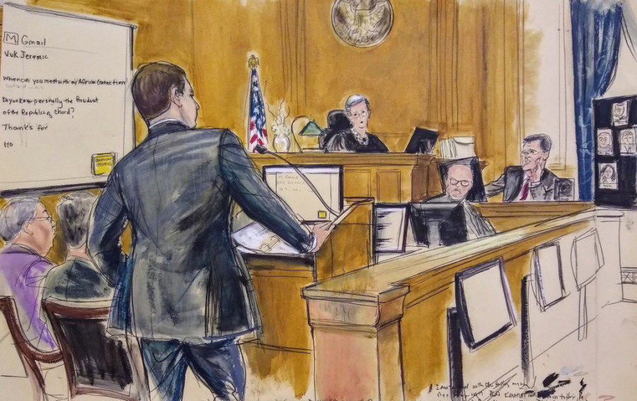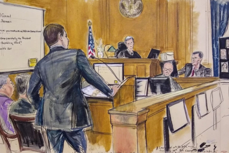 Agencije su, osim skica sa Jeremićem, objavile i ovu na kojoj možete da vidite kako pomoćnik američkog državnog tužioca Pol Hajden upire prstom na optuženog, biznismena iz Hong Konga, Patrika Hoa, tokom iznošenja uvodnih reči na suđenju.