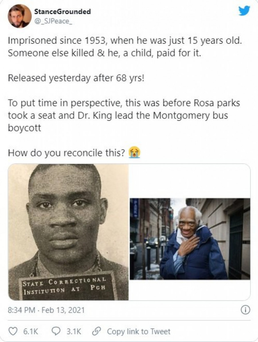 Foto: Printskrin/Tviter- Sada sam odrasla osoba, nisam više dete. Ne samo da sam odrastao, već sam i starac i svakim danom postajem sve stariji. Izašao sam iz zatvora posle 68 godina, a svet se okrenuo - rekao je Ligon koji je sada pušten na uslovnu slobodu, čime i nije baš oduševljen.