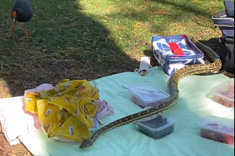 Na internetu je osvanuo snimak iz Australije na kojem se vidi ogromni piton kako upada na piknik. Grupa ljudi je bila prinuđena da gleda sa sigurne udaljenosti kako zmija klizi po njihovim stvarima.