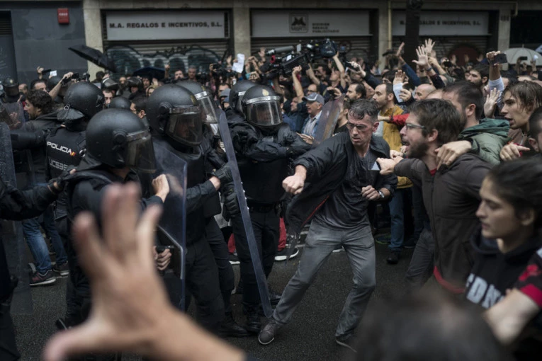 Foto: Tanjug/APPolicija je pendrecima udarala pristalice nezavisnosti, u pokušaju da spreči hiljade ljudi da dođu do kancelarije predstavnika španske vlade za Kataloniju, gde je najavljeno kontra okupljanje pristalica španskog jedinstva.