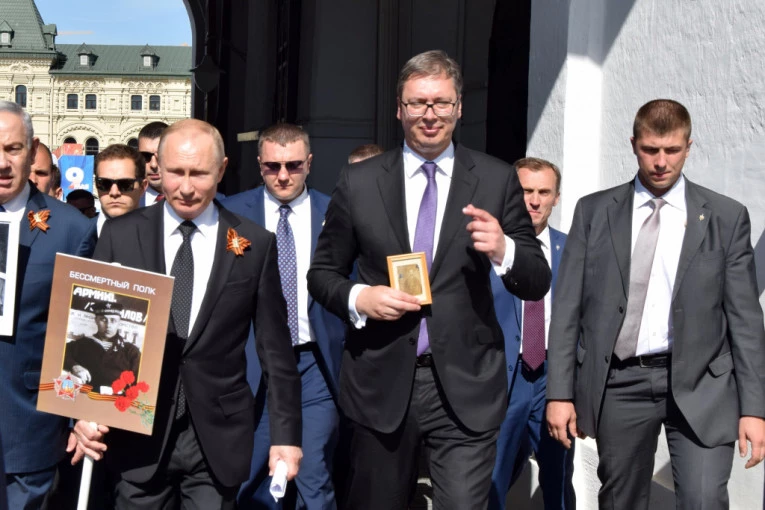 Foto: Tanjug/KABINET PREDSEDNIKA REPUBLIKE SRBIJEPodsetimo, na čelu Besmrtnog puka su se nalazili predsednik Rusije Vladimir Putin, predsednik Srbije Aleksandar Vučič i izraelski premijer Benjamin Netanijahu.