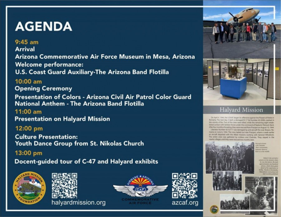 Događaj, čiji je domaćin zajedno sa Fondacijom Haliard Mission, održaće se u subotu, 12. aprila 2025. godine, u komemorativnom muzeju vazduhoplovnih snaga Arizone u Mesi. Ovaj komemorativni događaj će obuhvatiti niz aktivnosti, uključujući prezentaciju istorije misije, sa ciljem da se javnost upozna o ovom malo poznatom, ali značajnom poglavlju istorije Drugog svetskog rata.