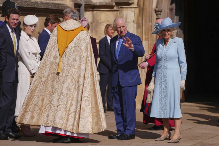 Veći broj ljudi je poželeo britanskom kralju i kraljici srećan Uskrs, dok su izlazili iz kapele, a dvoje dece je kraljici Kamili darivalo cveće.