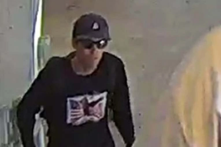Na slikama se vidi muškarac s crnim naočarima, bejzbol kačketom, crnom košuljom dugih rukava i farmerkama.