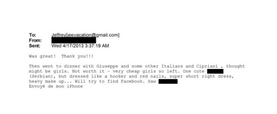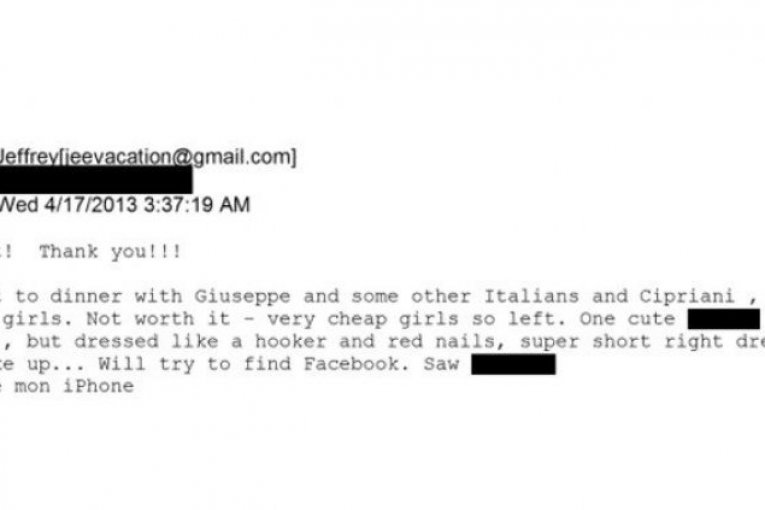 - Bilo je sjajno! Hvala ti! Zatim sam otišao na večeru sa Đuzepeom i još nekim Italijanima u "Kiprijani". Očekivao sam devojke, ali nije vredelo - bile su veoma jeftine. Jedna Srpkinja mi je zapala za oko, obučena poput prostitutke, crveni nokti, ultrakratka crvena haljina, jaka šminka... Pokušaću da pronađem njen Fejsbuk profil - napisao je Epstajn u mejlu poslatom 17. aprila 2013.