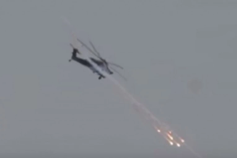Na kadrovima snimka vidi se kako ka položajima terorista ide Mi-35 koji na ciljeve ispaljuje projektile.