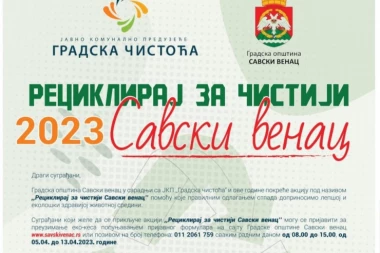 Beograd 15:40 05.04.2023 RECIKLIRAJ ZA ČISTIJI SAVSKI VENAC 2023: Opština poziva građane da učestvuju u akciji!