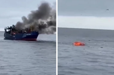 Svet 19:22 06.12.2025 NAREĐENA EVAKUACIJA POSADE ZAPALJENOG TANKERA: Brod napali dronovi pa završio nasukan blizu Ahtopola