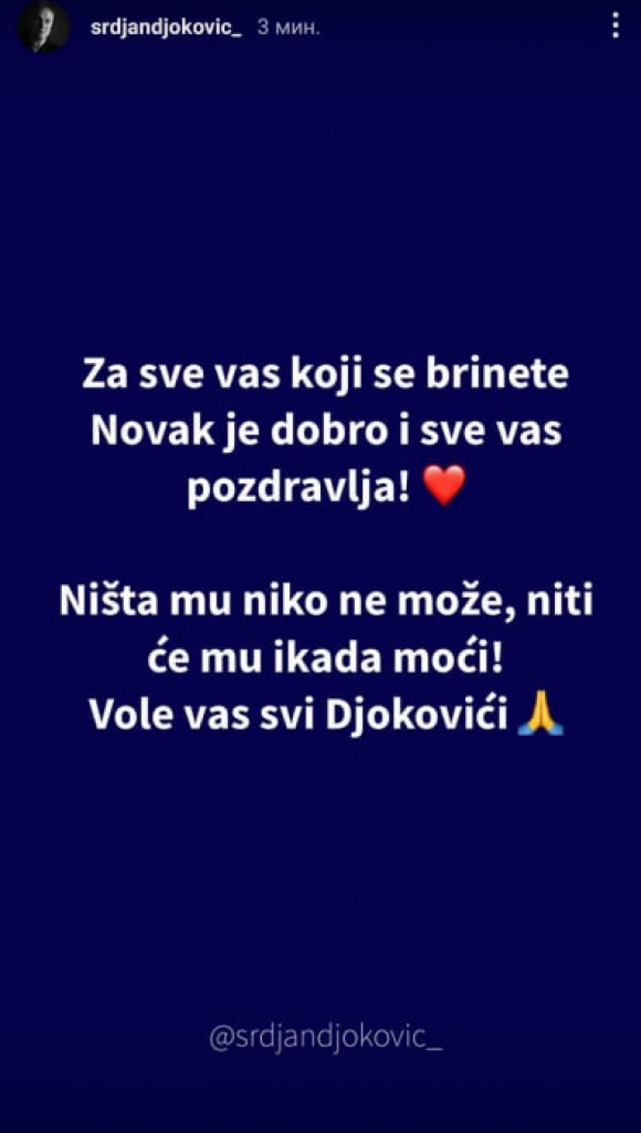 - For all of you who care, Novak is happy and wishes to greet all of you. Nobody can or will ever be able to do anything to him. The Djoković family loves you - Srdjan Djoković wrote on his Instagram account.