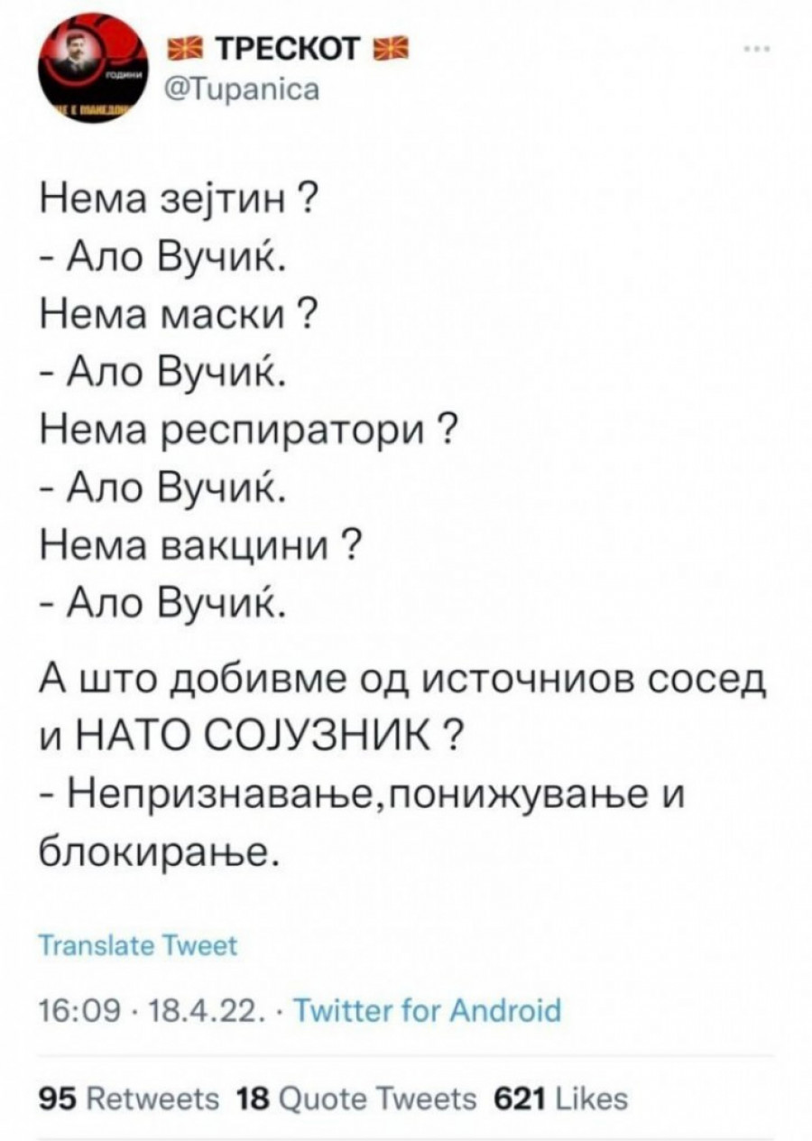 What is the point of his post - whenever it is difficult, Northern Macedonia asks for Serbia's help, and our country generously jumps in to help. Unlike us, they only received, as he states, "non-recognition, humiliation and blocking" from NATO countries.