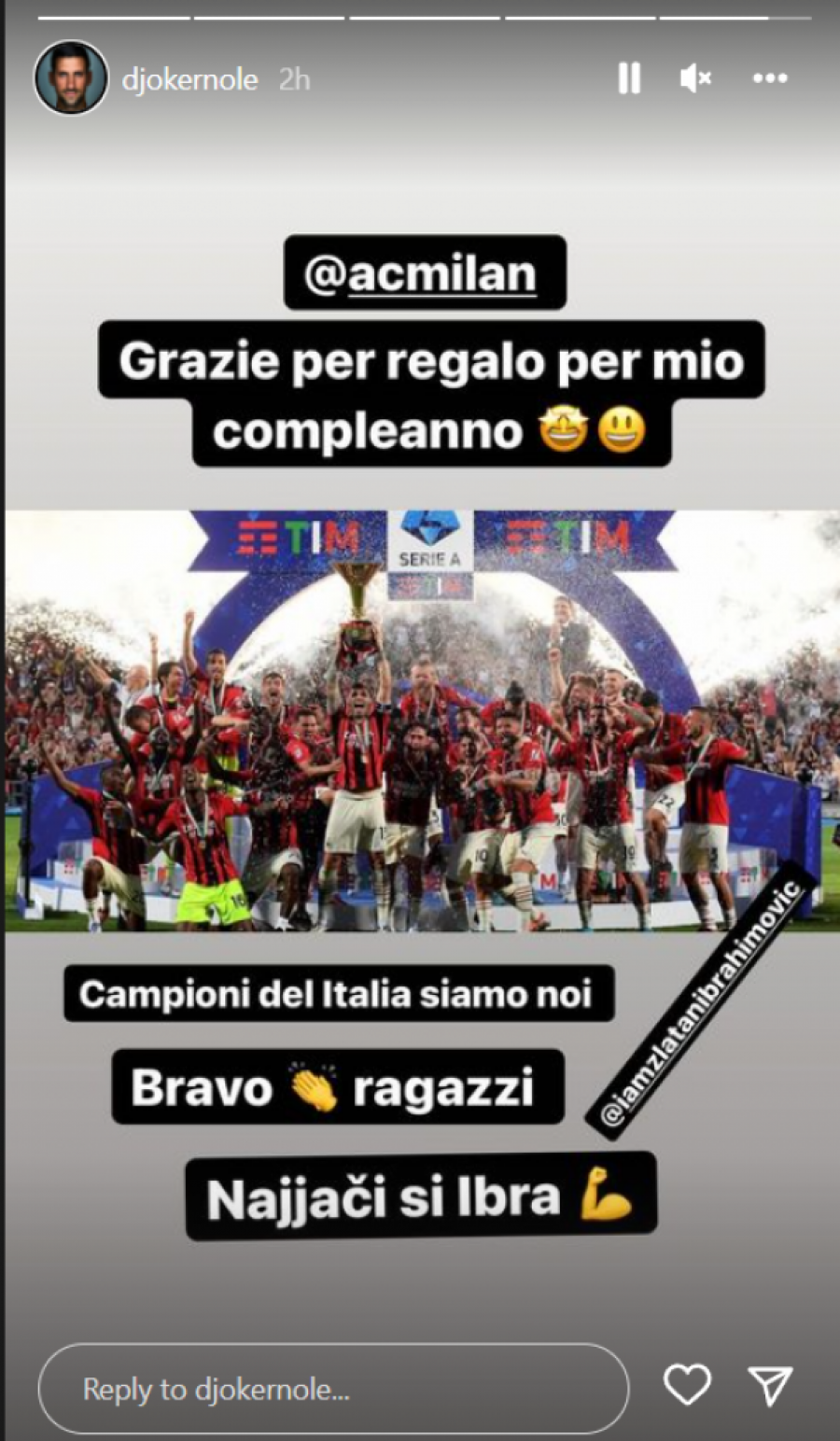 Serbian tennis player Novak Djoković posted a congratulatory message to Milan fans on Instagram.